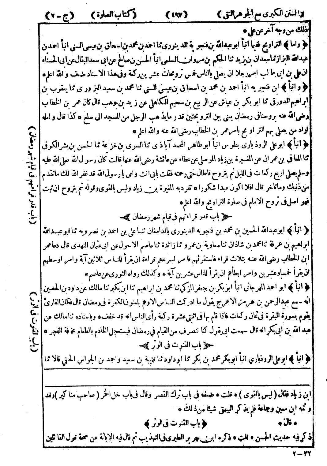 ابن زياد فقال (ليس بالقوى) * قلت * ضعفه؟؟ في باب ترك القصر وقال في باب خل الخمر (صاحب مناكير) وقد وثقه ابن معين وجماعة فلم يذكر البيهقى شيئا من ذلك * * قال * (باب القنوت في الوتر) ذكر فيه حديث الحسن * قلت * ذكره ابن جرير الطبري في التهذيب ثم قال فيه الابانة عن صحة قول القائلين