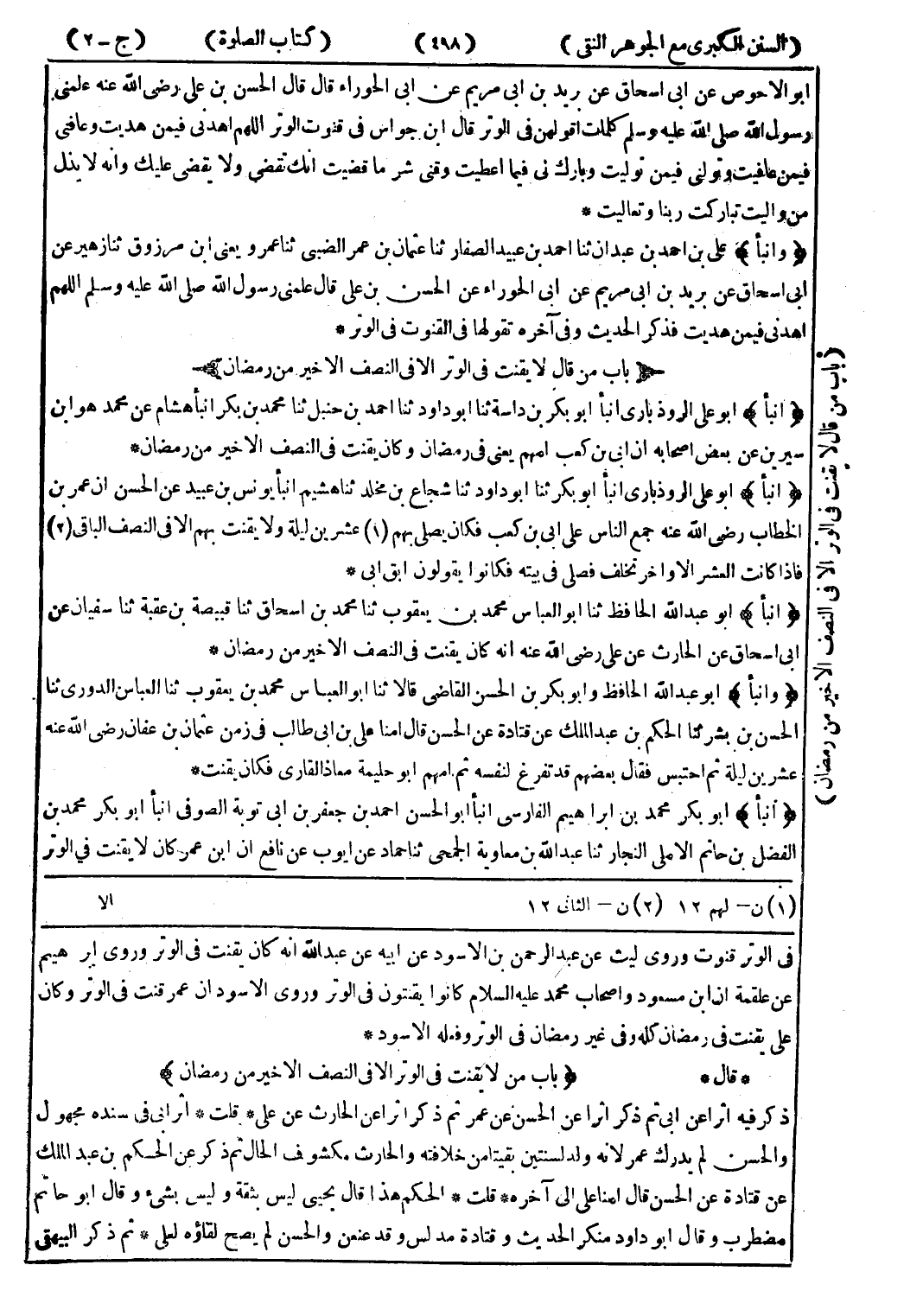 في الوتر قنوت وروى ليث عن عبد الرحمن بن الاسود عن ابيه عن عبد الله انه كان يقنت في الوتر وروى ابراهيم عن علقمة ان ابن مسعود واصحاب محمد عليه السلام كانوا يقنتون في الوتر وروى الاسود ان عمر قنت في الوتر وكان على يقنت في رمضان كله وفي غير رمضان في الوتر وفعله الاسود * * قال * (باب من لايقنت في الوتر الا في النصف الاخير من رمضان) ذكر فيه اثرا عن ابى ثم ذكر اثرا عن الحسن عن عمر ثم ذكر اثرا عن الحارث عن على * قلت * اثر ابى في سنده مجهول والحسن لم يدرك عمر لانه ولد لسنتين بقيتا من خلافته والحارث مكشوف الحال ثم ذكر عن الحكم بن عبد الملك عن قتادة عن الحسن قال امنا على إلى آخره * قلت * الحكم هذا قال يحيى ليس بثقة وليس بشئ وقال أبو حاتم مضطرب وقال أبو داود منكر الحديث وقتادة مدلس وقد عنعن والحسن لم يصح لقاؤه لعلى * ثم ذكر البيهقى