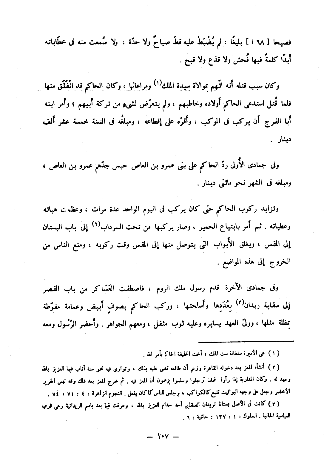 وفي جمادى الآخرة قدم رسول ملك الروم، فاصطفت العساكر من باب القصر إلى سقاية ريدان بعددها وأسلحتها، وركب الحاكم بصوف أبيض وعمامة مفوطة بمظلة مثلها، وولي العهد يسايره وعليه ثوب مثقل، ومعهم الجواهر. وأحضر الرسول ومعه