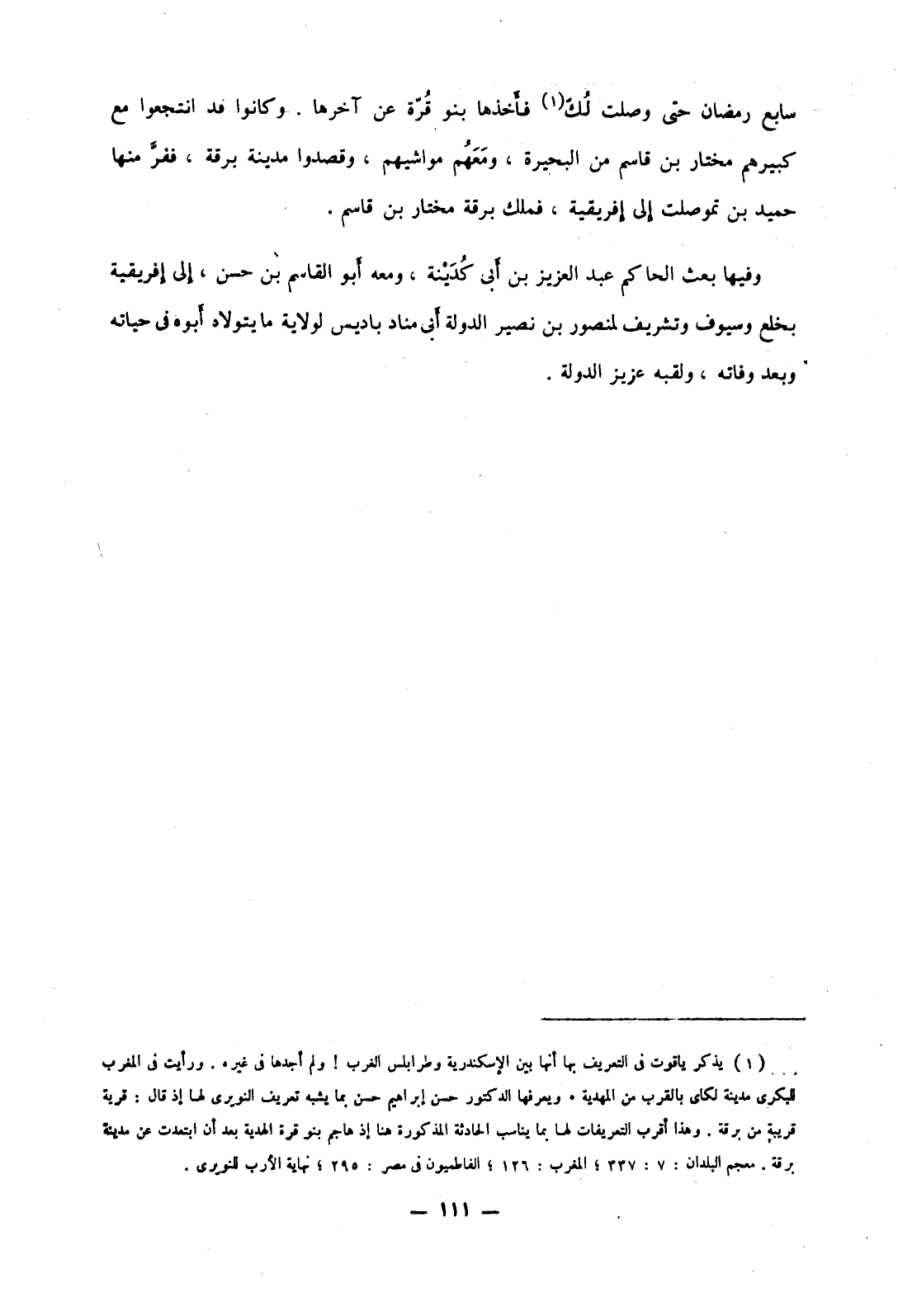 سابع رمضان حتى ولت لك فأخذها بنو قرة عن آخرها. وكانوا قد انتجعوا مع كبيرهم مختار بن قاسم من البحيرة، ومعهم مواشيهم، وقصدوا مدينة برقة، ففر منها حميد بن تموصلت إلى إفريقية، فملك برقة مختار بن قاسم.