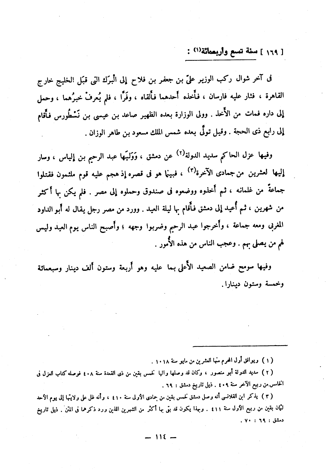 وفيها عزل الحاكم سديد الدولة عن دمشق، ووليها عبد الرحيم بن إلياس، وسار إليها لعشرين من جمادى الآخرة، فبينما هو قصره إذ هجم عليه قوم ملثمون فقتلوا جماعةً من غلمانه، ثم أخذوه ووضعوه في صندوق وحملوه إلى مصر. فلم يكن بها أكثر من شهرين، ثم أعيد إلى دمشق فأقام بها ليلة العيد. وورد من مصر رجل يقال له أبو الداود المغربي ومعه جماعة، وأخرجوا عبد الرحيم وضربوا وجهه؛ وأصبح الناس يوم العيد وليس لهم من يصلي بهم. وعجب الناس من هذه الأمور.