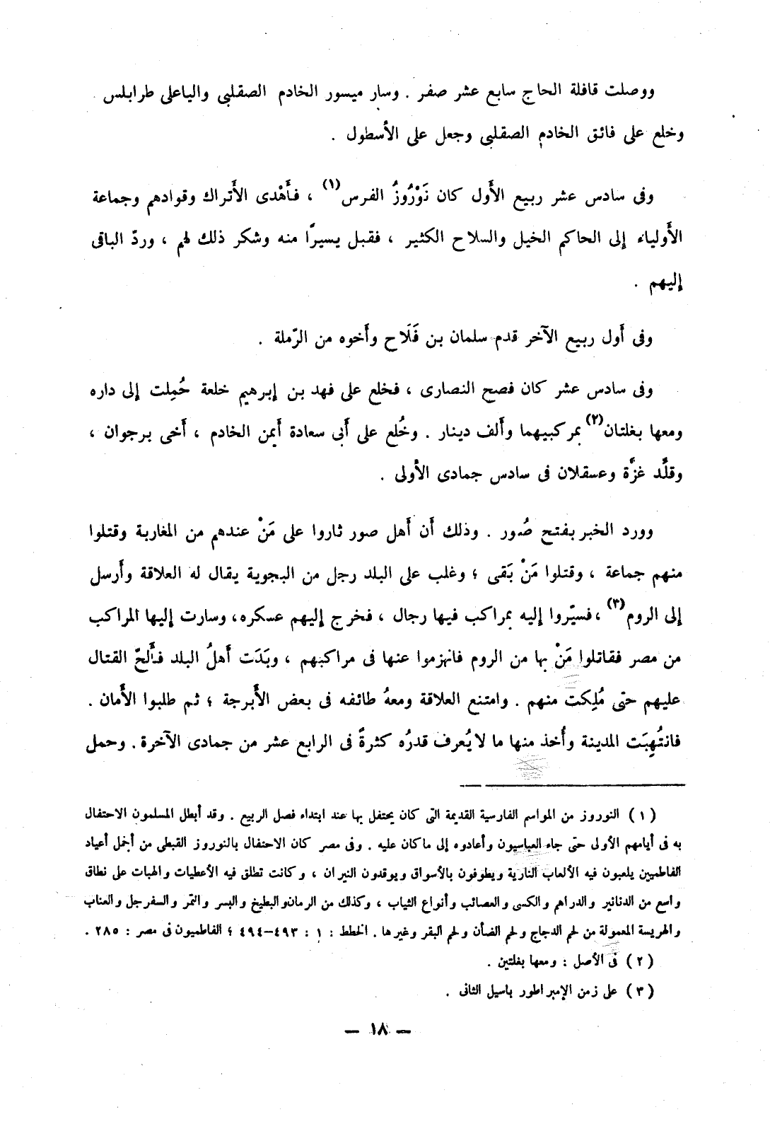 ووصلت قافلة الحاج سابع عشر صفر. وسار ميسور الخادم الصقلبي والباعلي طرابلس وخلع على فائق الخادم الصقلبي وجعل على الأسطول.