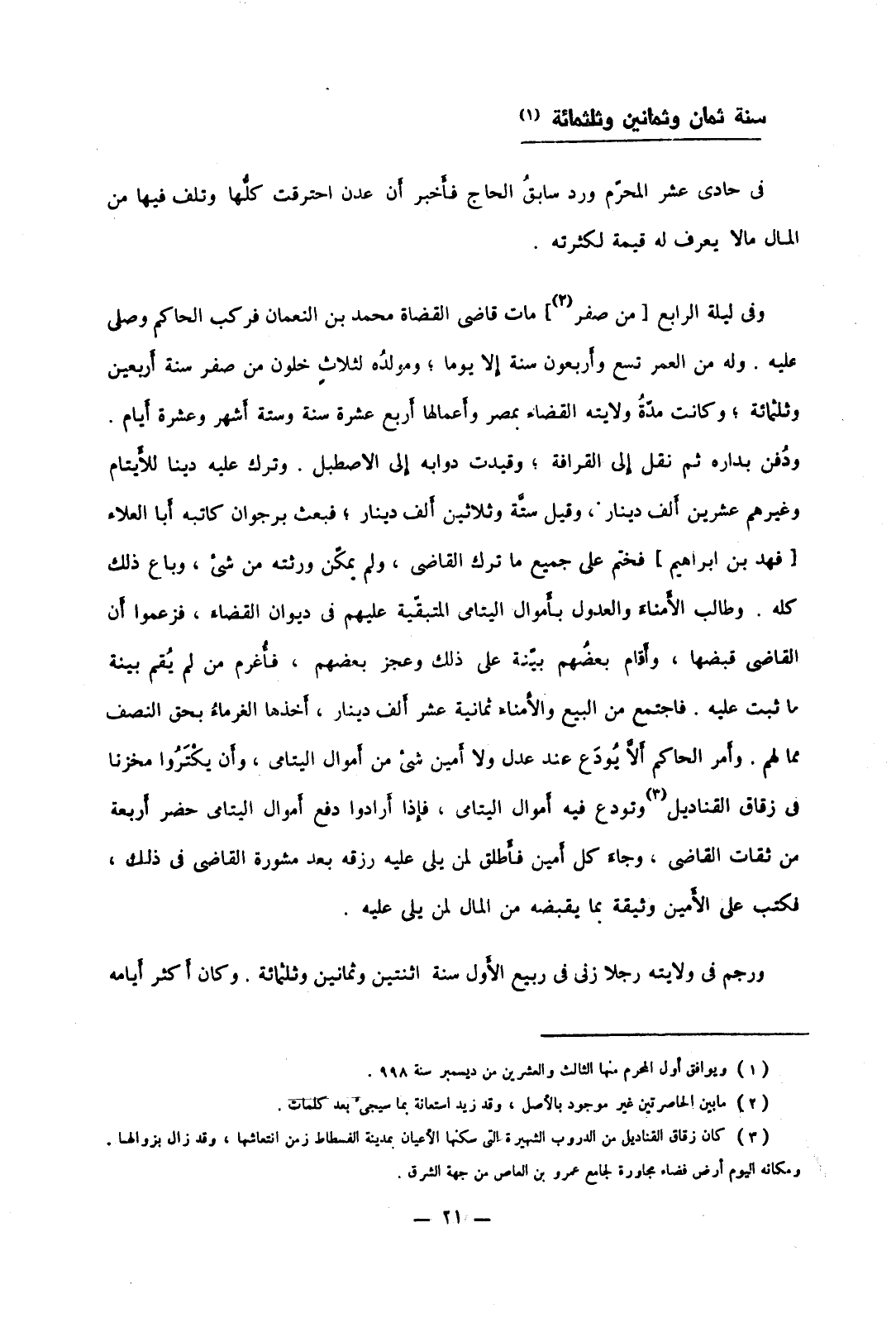 وفي ليلة الرابع من صفر مات قاضي القضاة محمد بن النعمان فركب الحاكم وصلى عليه. وله من العمر تسع وأربعون سنة إلا يوما؛ ومولده لثلاث خلون من صفر سنة أربعين وثلثمائة؛ وكانت مدة ولايته القضاء بمصر وأعمالها أربع عشرة سنة وستة أشهر وعشرة أيام. ودفن بداره ثم نقل إلى القرافة؛ وقيدت دوابه إلى الاصطبل. وترك عليه دينا للأيتام وغيرهم عشرين ألف دينار، وقيل ستة وثلاثين ألف دينار؛ فبعث برجوان كاتبه أبا العلاء فهد بن ابراهيم فختم على جميع ما ترك القاضي، ولم يمكن ورثته من شيء، وباع ذلك كله. وطالب الأمناء والعدول بأموال اليتامى المتبقية عليهم في ديوان القضاء، فزعموا أن القاضي قبضها، وأقام بعضهم بينة على ذلك وعجز بعضهم، فأغرم من لم يقم بينة ما ثبت عليه. فاجتمع من البيع والأمناء ثمانية عشر ألف دينار، أخذها الغرماء بحق النصف مما لهم. وأمر الحاكم ألا يودع عند عدل ولا أمين شيء من أموال اليتامى، وأن يكتروا مخزنا في زقاق القناديل وتودع فيه أموال اليتامى، فإذا أرادوا دفع أموال اليتامى حضر أربعة من ثقات القاضي، وجاء كل أمين فأطلق لمن يلي عليه رزقه بعد مشورة القاضي في ذلك، فكتب على الأمين وثيقة بما بقبضه من المال لمن يلي عليه.