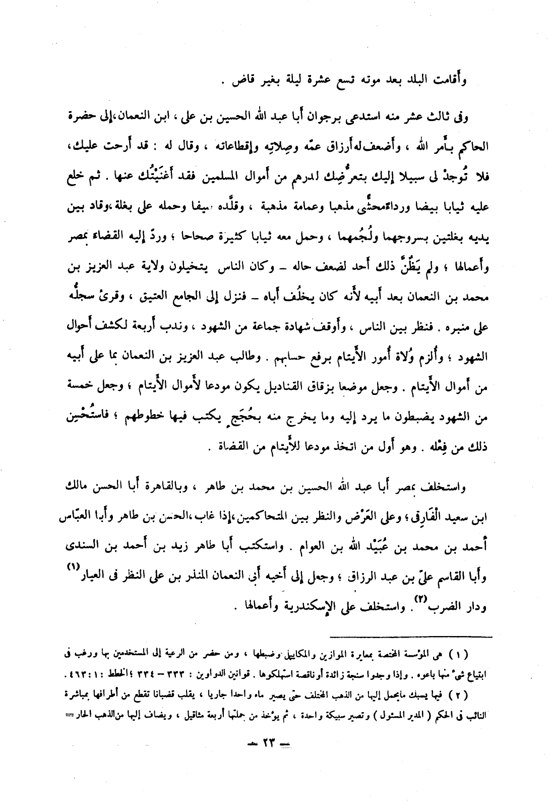 وفي ثالث عشر منه استدعى برجوان أبا عبد الله الحسين بن علي، ابن النعمان، إلى حضرة الحاكم بأمر الله، وأضعف له أرزاق عمه وصلاته وإقطاعاته، وقال له: قد أرحت عليك، فلا توجد لي سبيلا إليك بتعرضك لدرهم من أموال المسلمين فقد أغنيتك عنها. ثم خلع عليه ثيابا بيضا ورداءً محشّى مذهبا وعمامة مذهبة، وقلده سيفا وحمله على بغلة، وقاد بين يديه بغلتين بسروجهما ولجمهما، وحمل معه ثيابا كثيرة صحاحا؛ ورد إليه القضاء بمصر وأعمالها؛ ولم يظن ذلك أحد لضعف حاله وكان الناس يتخيلون ولاية عبد العزيز بن محمد بن النعمان بعد أبيه لأنه كان يخلف أباه فنزل إلى الجامع العتيق، وقرئ سجله على منبره. فنظر بين الناس، وأوقف شهادة جماعة من الشهود، وندب أربعة لكشف أحوال الشهود؛ وألزم ولاة أمور الأيتام برفع حسابهم. وطالب عبد العزيز بن النعمان بما على أبيه من أموال الأيتام. وجعل موضعا بزقاق القناديل يكون مودعا لأموال الأيتام، وجعل خمسة من الشهود يضبطون ما يرد إليه وما يخرج منه بحجج يكتب فيها خطوطهم؛ فاستحسن ذلك من فعله. وهو أول من اتخذ مودعا للأيتام من القضاة.