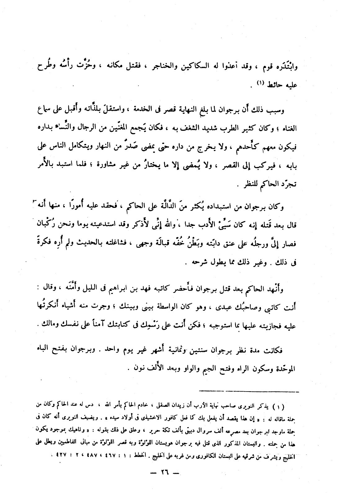 وأنهد الحاكم بعد قتل برجوان فأحضر كاتبه فهد بن إبراهيم في الليل وأمنه، وقال: أنت كاتبي وصاحبك عبدي، وهو كان الواسطة بيني وبينك؛ وجرت منه أشياء أنكرتها عليه فجازيته عليها بما استوجبه؛ فكن أنت على رسمك في كتابك آمناً على نفسك ومالك.
