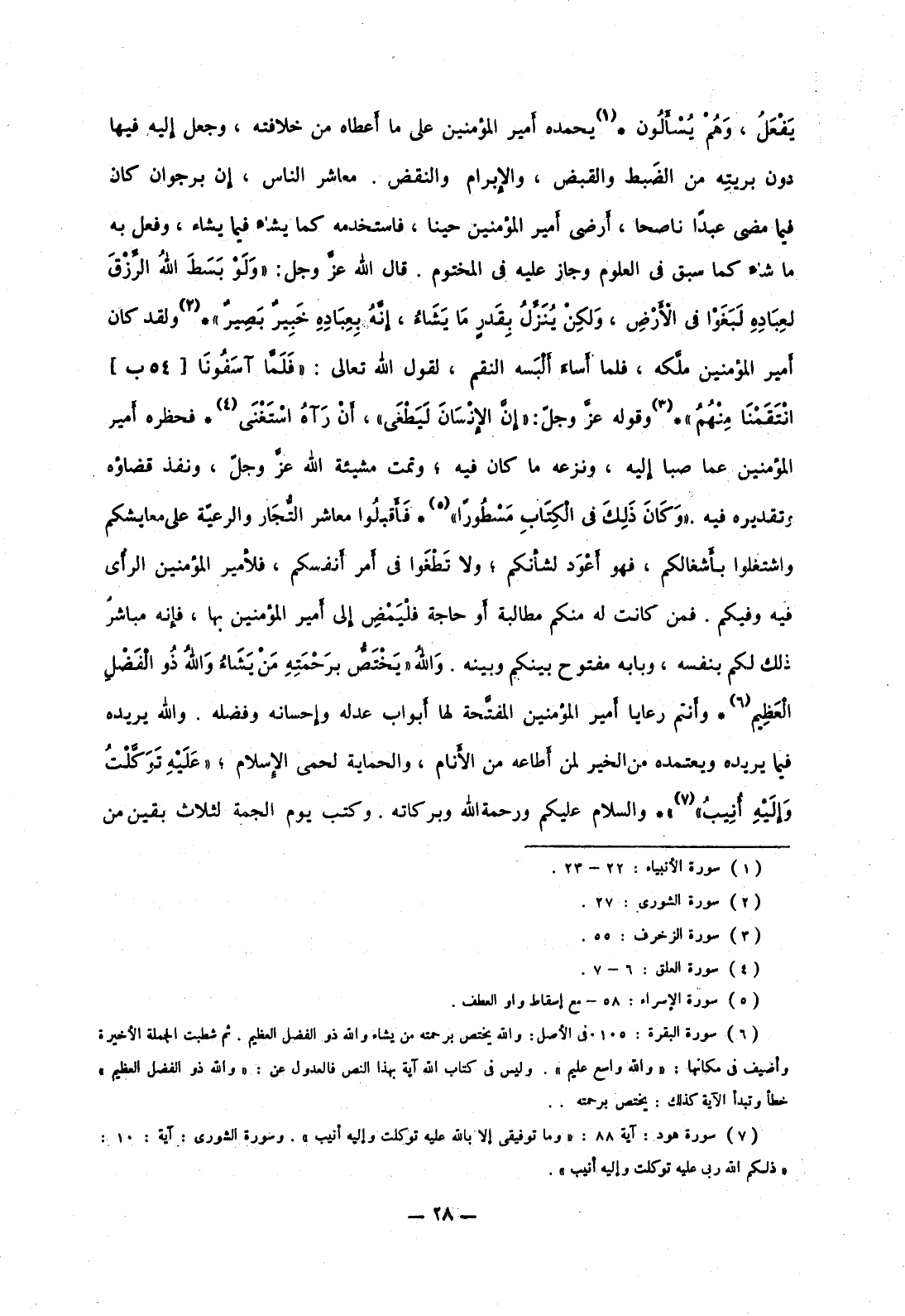 يَفْعَلُ، وَهُمْ يُسْأَلُون " يحمده أمير المؤمنين على ما أعطاه من خلافته، وجعل إليه فيها دون بريته من الضبط والقبض، والإبرام والنقض. معاشر الناس، إن برجوان كان فيما مضى عبداً ناصحا، أرضى أمير المؤمنين حينا، فاستخدمهم كما يشاء فيما يشاء، وفعل به ما شاء كما سبق في العلوم وجاز عليه في المختوم. قال الله عز وجل: " وَلَوْ بَسَطَ اللهُ الرِّزْقَ لعِبَادِهِ لَبَغَوْا في الأَرْضِ، وَلكِنْ يُنَزِّلُ بِقَدرٍ مِا يَشَاءُ، إِنَّهُ بِعِبَادِهِ خَبِيرٌ بَصِيرٌ " ولقد كان أمير المؤمنين ملكه، فلما أساء ألبسه النقم، لقول الله تعالى: " فَلَمَّا آسَفُونَا انْتَقَمْنَا مِنْهُمُ " وقوله عز وجل: " إِنَّ الإِنْسَانَ لَيَطْغَى "، أن رآه استغنى فحظره أمير المؤمنين عما صبا إليه، ونزعه ما كان فيه؛ وتمت مشيئة الله عز وجل، ونفذ قضاؤه وتقديره فيه. " وَكَانَ ذَلِكَ في الْكِتَابِ مَسْطُوراً " فأقبلوا معاشر التجار والرعية على معايشكم واشتغلوا بأشغالكم، فهو أعود لشأنكم؛ ولا تطغوا في أمر أنفسكم فلأمير المؤمنين الرأي فيه وفيكم. فمن كانت له منكم مطالبة أو حاجة فليمض إلى أمير المؤمنين بها، فإنه مباشر ذلك لكم بنفسه، وبابه مفتوح بينكم وبينه. والله " يَخْتَصُّ برَحْمَتِهِ مَنْ يَشَاءُ وَاللهُ ذُو الْفَضْلِ الْعَظِيم وأنتم رعايا أمير المؤمنين المفتحة لها أبواب عدله وإحسانه وفضله. والله يريده فيما يريده ويعتمده من الخير لمن أطاعه من الأنام، والحماية لحمى الإسلام؛ " عَلَيْهٍ تَوَكَّلْتُ وَإِلَيْهِ أُنِيبُ " والسلام عليكم ورحمة الله وبركاته. وكتب يوم الجمعة لثلاث بقين من