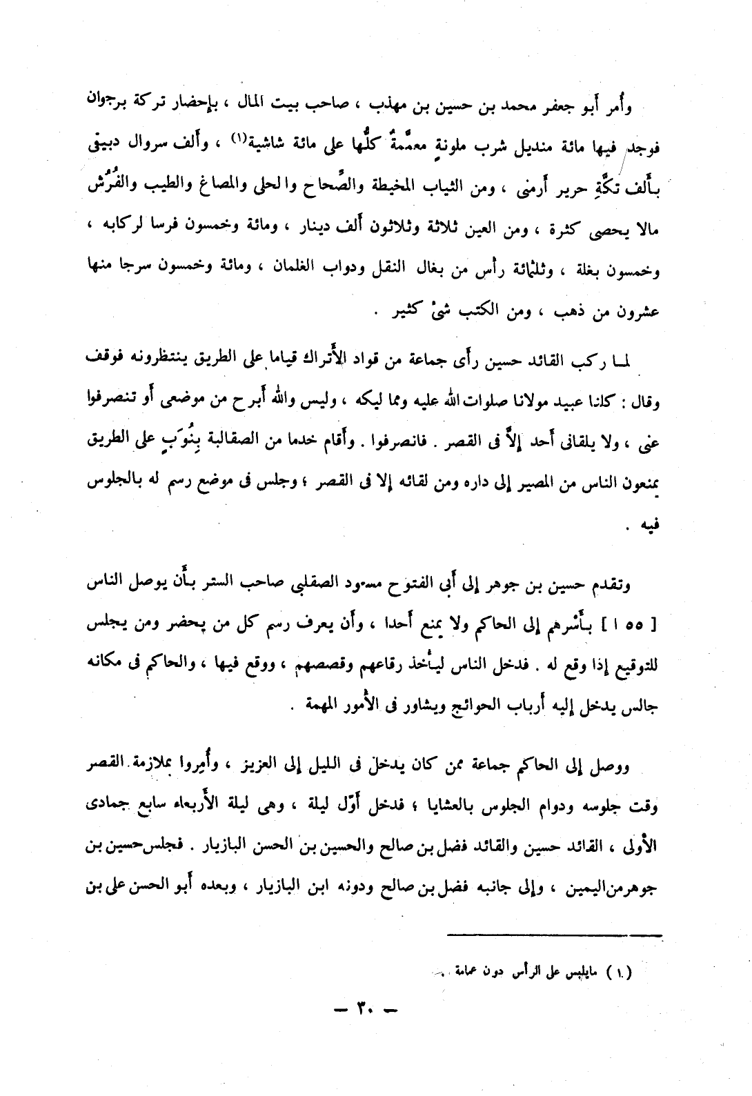 لما ركب القائد حسين رأى جماعة من قواد الأتراك قياما على الطريق ينتظرونه فوقف وقال: كلنا عبيد مولانا صلوات الله عليه ومماليكه، وليس والله أبرح من موضعي أو تنصرفوا عني، ولا يلقاني أحد إلا في القصر. فانصرفوا. وأقام خدما من الصقالبة بنوب على الطريق يمنعون الناس من المصير إلى داره ومن لقائه إلا في القصر؛ وجلس في موضع رسم له بالجلوس فيه.