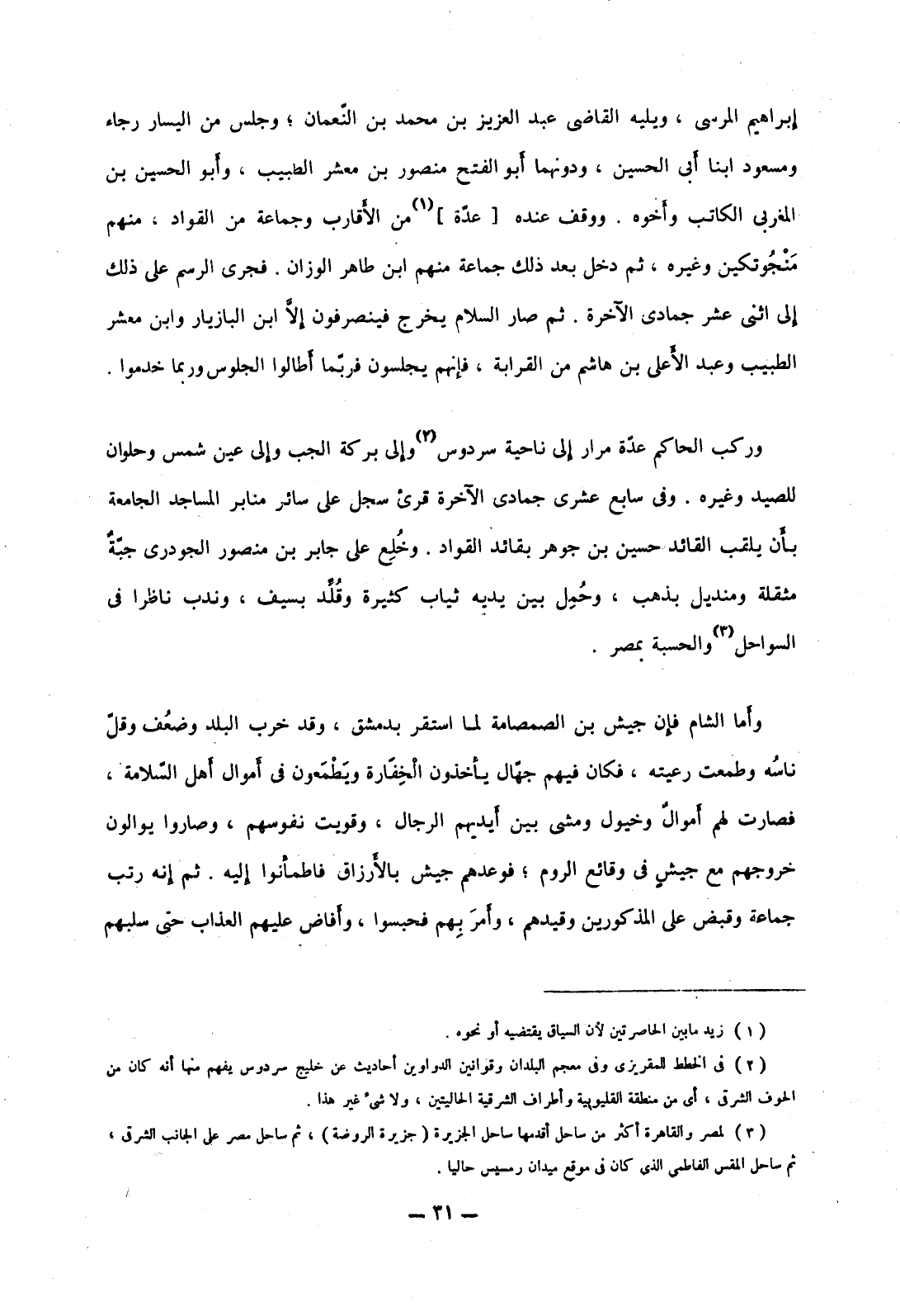 وأما الشام فإن جيش بن الصمصامة لما استقر بدمشق، وقد خرب البلد وضعف وقل ناسه وطمعت رعيته، فكان فيهم جهال يأخذون الخفارة ويطمعون في أموال أهل السلامة، فصارت لهم أموال وخيول ومشى بين أيديهم الرجال، وقويت نفوسهم، وصاروا يوالون خروجهم مع جيش في وقائع الروم؛ فوعدهم جيش بالأرزاق فاطمأنوا إليه. ثم إنه رتب جماعة وقبض على المذكورين وقيدهم، وأمر بهم فحبسوا، وأفاض عليهم العذاب حتى سلبهم