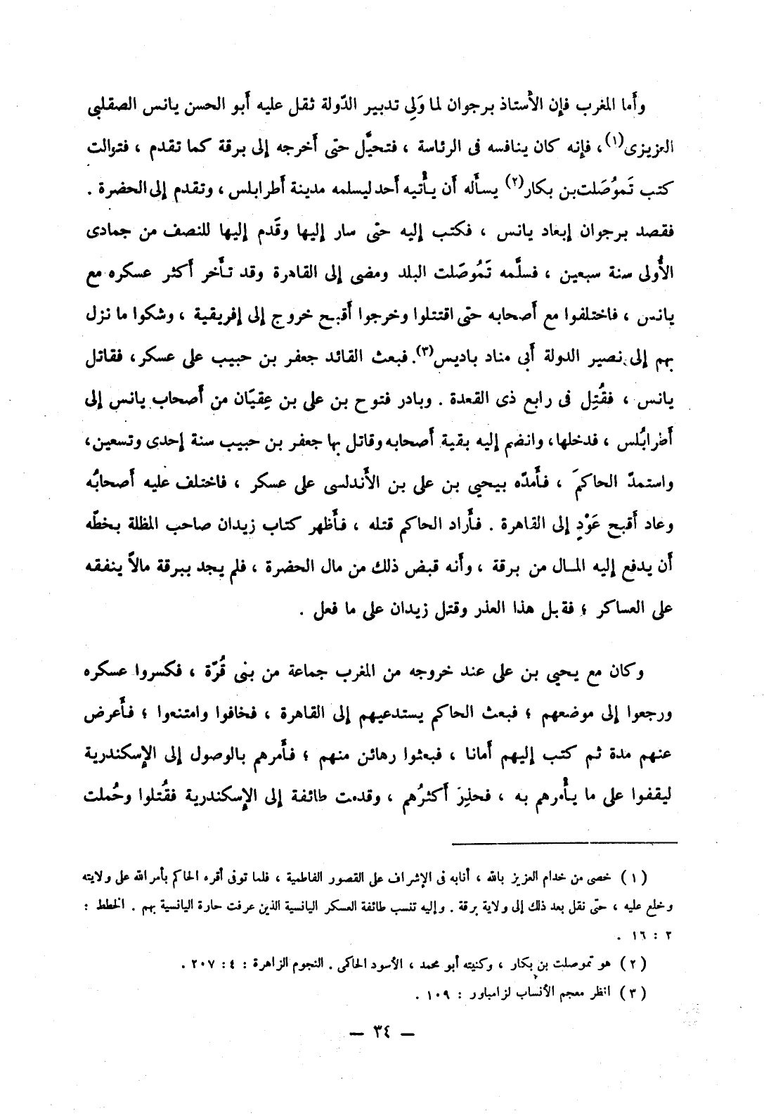 وأما المغرب فإن الأستاذ برجوان لما ولى تدبير الدولة ثقل عليه أبو الحسن يانس الصقلبي العزيزي، فإنه كان ينافسه في الرئاسة، فتحيل حتى أخرجه إلى برقة كما تقدم، فتوالت كتب تموصلت بن بكار يسأله أن يأتيه أحد ليسلمه مدينة أطرابلس، وتقدم إلى الحضرة. فقصد برجوان إبعاد يانس، فكتب إليه حتى سار إليها وقدم إليها للنصف من جمادى الأولى سنة سبعين، فسلمه تموصلت البلد ومضى إلى القاهرة وقد تأخر أكثر عسكره مع يانس، فاختلفوا مع أصحابه حتى اقتتلوا وخرجوا أقبح خروج إلى إفريقية، وشكوا ما نزل بهم إلى نصير الدولة أبي مناد باديس. فبعث القائد جعفر بن حبيب على عسكر، فقاتل يانس، فقتل في رابع ذي القعدة. وبادر فتوح بن علي بن عقيان من أصحاب يانس إلى أطرابلس، فدخلها، وانضم إليه بقية أصحابه وقاتل بها جعفر بن حبيب سنة إحدى وتسعين، واستمد الحاكم، فأمده بيحيى بن علي بن الأندلسي على عسكر، فاختلف عليه أصحابه وعاد أقبح عود إلى القاهرة. فأراد الحاكم قتله، فأظهر كتاب زيدان صاحب المظلة بخطه أن يدفع إليه المال من برقة، وأنه قبض ذلك من مال الحضرة، فلم يجد ببرقة مالاً ينفقه على العساكر؛ فقبل هذا العذر وقتل زيدان على ما فعل.
