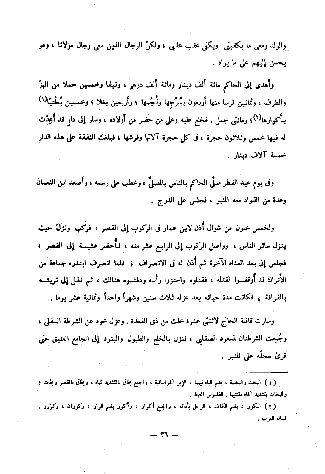 وأهدى إلى الحاكم مائة ألف دينار ومائة ألف درهم، ونيفا وخمسين حملا من البز والطرف، وثمانين فرسا منها أربعون بسرجها ولجمها؛ وأربعين بغلا؛ وخمسين بختيا بأكوارها؛ ومائتي جمل. فخلع عليه وعلى من حضر من أولاده، وسار إلى دار قد أعدت له فيها خمس وثلاثون حجرة، في كل حجرة آلاتها وفرشها؛ فبلغت النفقة على هذه الدار خمسة آلاف دينار.