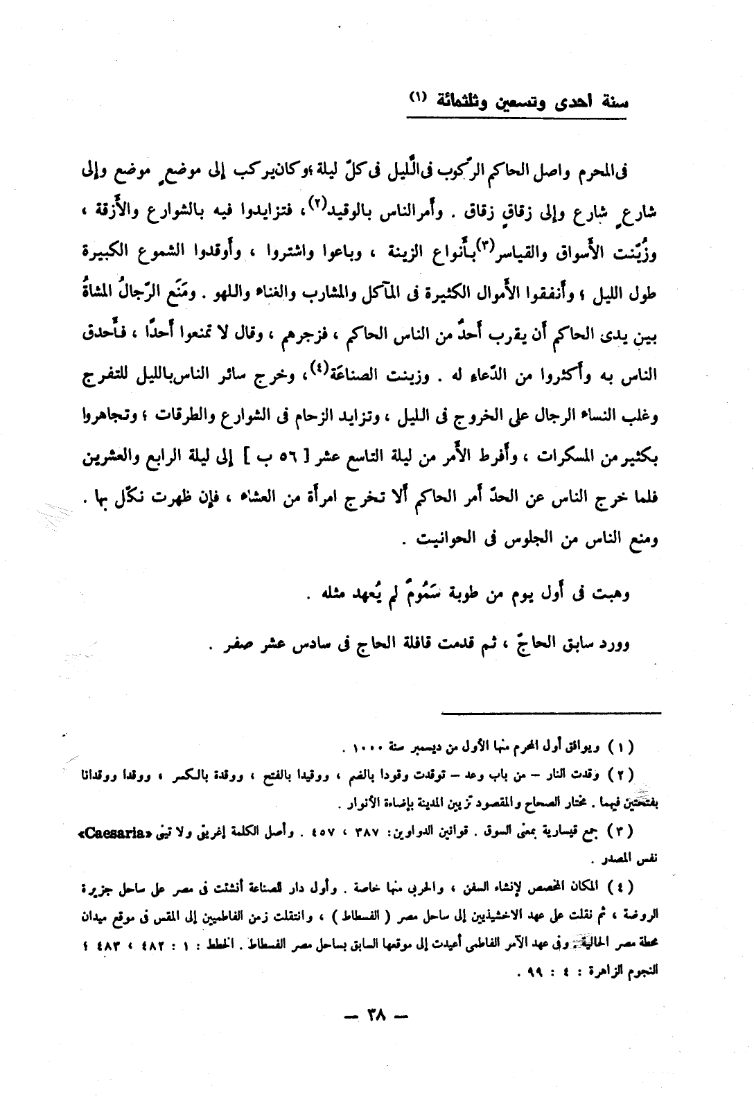 في المحرم واصل الحاكم الركوب في الليل في كل ليلة؛ وكان يركب إلى موضع موضع وإلى شارع شارع وإلى زقاق زقاق. وأمر الناس بالوقيد، فتزايدوا فيه بالشوارع والأزقة، وزينت الأسواق والقياسر بأنواع الزينة، وباعوا واشتروا، وأوقدوا الشموع الكبيرة طول الليل؛ وأنفقوا الأموال الكثيرة في المآكل والمشارب والغناء واللهو. ومنع الرجال المشاة بين يدي الحاكم أن يقرب أحد من الناس الحاكم، فزجرهم، وقال لا تمنعوا أحداً، فأحدق الناس به وأكثروا من الدعاء له. وزينت الصناعة، وخرج سائر الناس بالليل للتفرج وغلب النساء الرجال على الخروج في الليل، وتزايد الزحام في الشوارع والطرقات؛ وتجاهروا بكثير من المسكرات، وأفرط الأمر من ليلة التاسع عشر إلى ليلة الرابع والعشرين فلما خرج الناس عن الحد أمر الحاكم ألا تخرج امرأة من العشاء، فإن ظهرت نكل بها. ومنع الناس من الجلوس في الحوانيت.