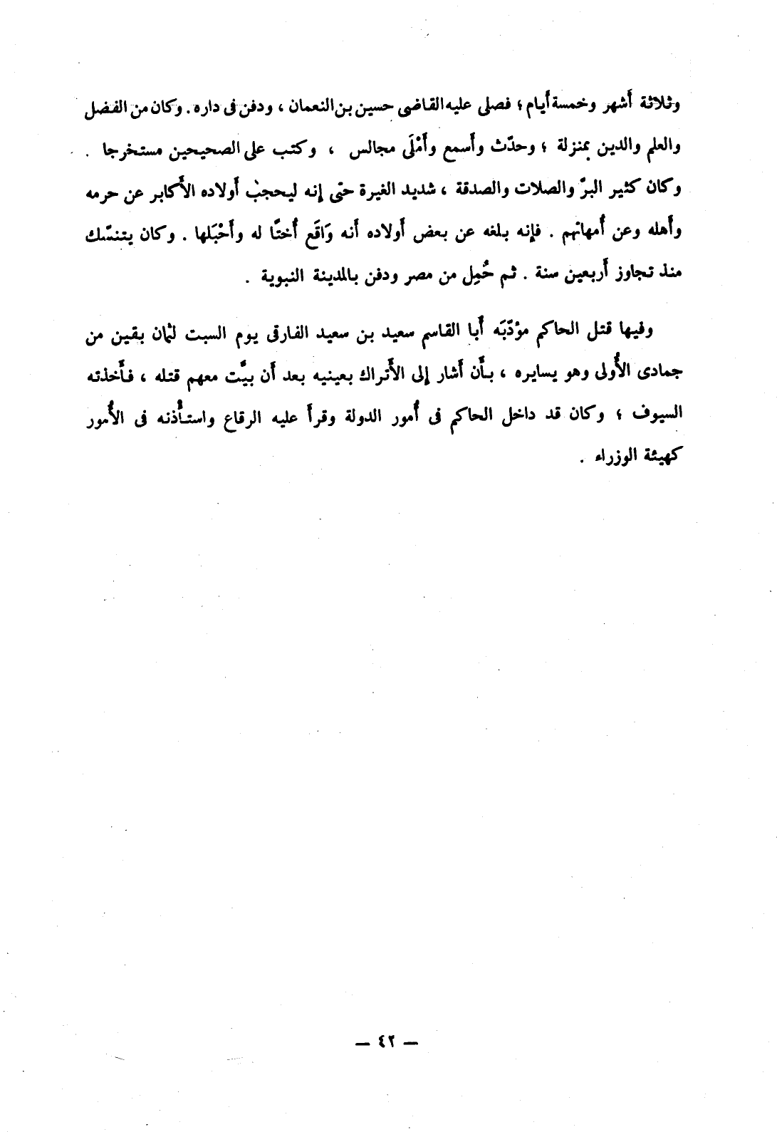 وثلاثة أشهر وخمسة أيام؛ فصلى عليه القاضي حسين بن النعمان، ودفن في داره. وكان من الفضل والعلم والدين بمنزلة؛ وحدث وأسمع وأملى مجالس، وكتب على الصحيحين مستخرجا وكان كثير البرد والصلات والصدقة، شديد الغيرة حتى إنه ليحجب أولاده الأكابر عن حرمه وأهله وعن أمهاتم. فإنه بلغه عن بعض أولاده أنه واقع أختا له وأحبلها. وكان يتنسك منذ تجاوز أربعين سنة. ثم حمل من مصر ودفن بالمدينة النبوية.
