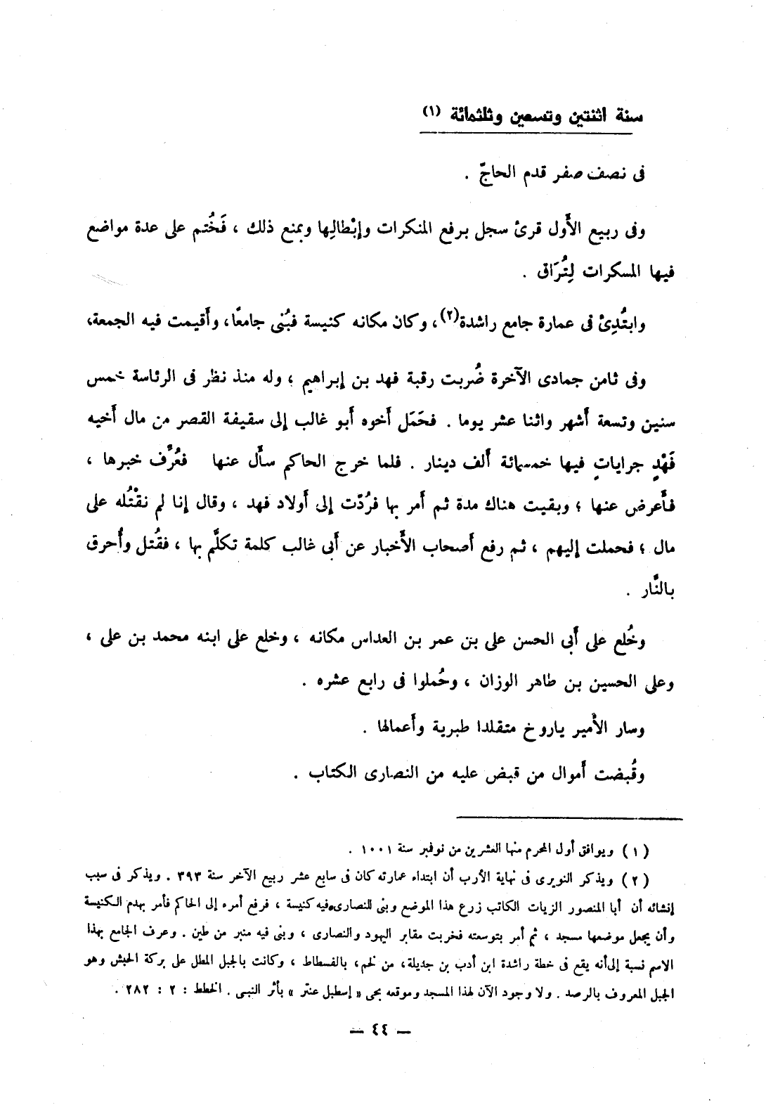 وابتدئ في عمارة جامع راشدة، وكان مكانه كنيسة فبنى جامعاً، وأقيمت فيه الجمعة، وفي ثامن جمادى الآخرة ضربت رقبة فهد بن إبراهيم، وله منذ نظر في الرئاسة خمس سنين وتسعة أشهر واثنا عشر يوما. فحمل أخوه أبو غالب إلى سقيفة القصر من مال أخيه فهد جرايات فيها خمسمائة ألف دينار. فلما خرج الحاكم سأل عنها فعرف خبرها، فأعرض عنا؛ وبقيت هناك مدة ثم أمر بها فردت إلى أولاد فهد، وقال إنا لم نقتله على مال؛ فحملت إليهم، ثم رفع أصحاب الأخبار عن أبي غالب كلمة تكلم بها، فقتل وأحرق بالنار.