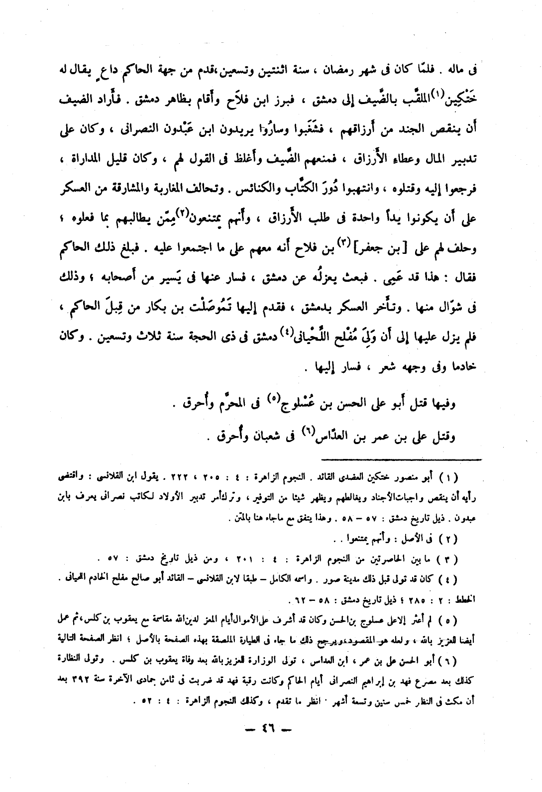 في ماله. فلما كان في شهر رمضان، سنة اثنتين وتسعين، قدم من جهة الحاكم داع يقال له ختكين الملقب بالضيف إلى دمشق، فبرز ابن فلاح وأقام بظاهر دمشق. فأراد الضيف أن ينقص الجند من أرزاقهم، فشغبوا وساروا يريدون ابن عبدون النصراني، وكان على تدبير المال وعطاء الأرزاق، فمنعهم الضيف وأغلظ في القول لهم، وكان قليل المداراة، فرجعوا إليه وقتلوه، وانتهبوا دور الكتاب والكنائس. وتحالف المغاربة والمشارقة من العسكر على أن يكونوا يداً واحدة في طلب الأرزاق، وأنهم يمتنعون ممن يطالبهم بما فعلوه؛ وحلف لهم علي بن جعفر بن فلاح أنه معهم على ما اجتمعوا عليه. فبلغ ذلك الحاكم فقال: هذا قد عمى. فبعث يعزله عن دمشق، فسار عنها في يسير من أصحابه؛ وذلك في شوال منها. وتأخر العسكر بدمشق، فقدم إليها تموصلت بن بكار من قبل الحاكم، فلم يزل عليها إلى أن ولي مفلح اللحياني دمشق في ذي الحجة