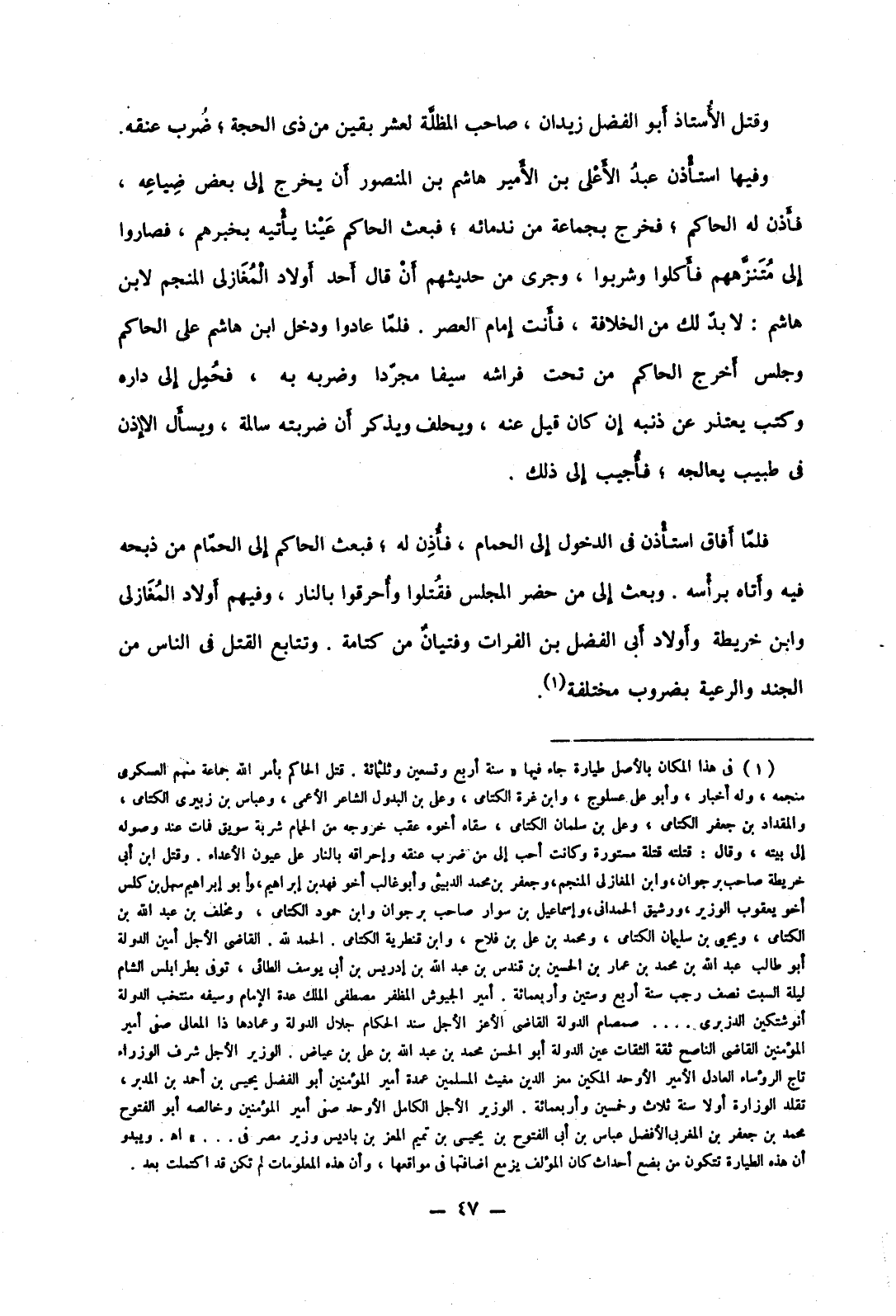 فلما أفاق استأذن في الدخول إلى الحمام، فأذن له؛ فبعث الحاكم إلى الحمام من ذبحه فيه وأتاه برأسه. وبعث إلى من حضر المجلس فقتلوا وأحرقوا بالنار، وفيهم أولاد المغازلي وابن خريطة وأولاد أبي الفضل بن الفرات وفتيان من كتامة. وتتابع القتل في الناس من الجند والرعية بضروب مختلفة.
