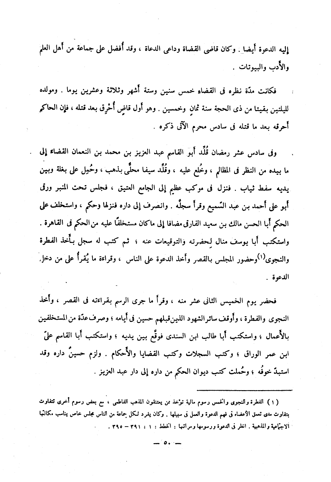 وفي سادس عشر رمضان قلد أبو القاسم عبد العزيز بن محمد بن النعمان القضاء إلى ما بيده من النظر في المظالم، وخلع عليه، وقلد سيفا محلى بذهب، وحمل على بغلة وبين يديه سفط ثياب. فنزل في موكب عظيم إلى الجامع العتيق، فجلس تحت المنبر ورقى أبو علي أحمد بن عبد السميع وقرأ سجله. وانصرف إلى داره فنزلها وحكم، واستخلف على الحكم أبا الحسن مالك بن سعيد الفارقي مضافا إلى ما كان مستخلفاً عليه من الحكم في القاهرة. واستكتب أبا يوسف منال لحضرته والتوقيعات عنه؛ ثم كتب له سجل بأخذ الفطرة والنجوى وحضور المجلس بالقصر وأخذ الدعوة على الناس، وقراءة ما يقرأ على من دخل الدعوة.