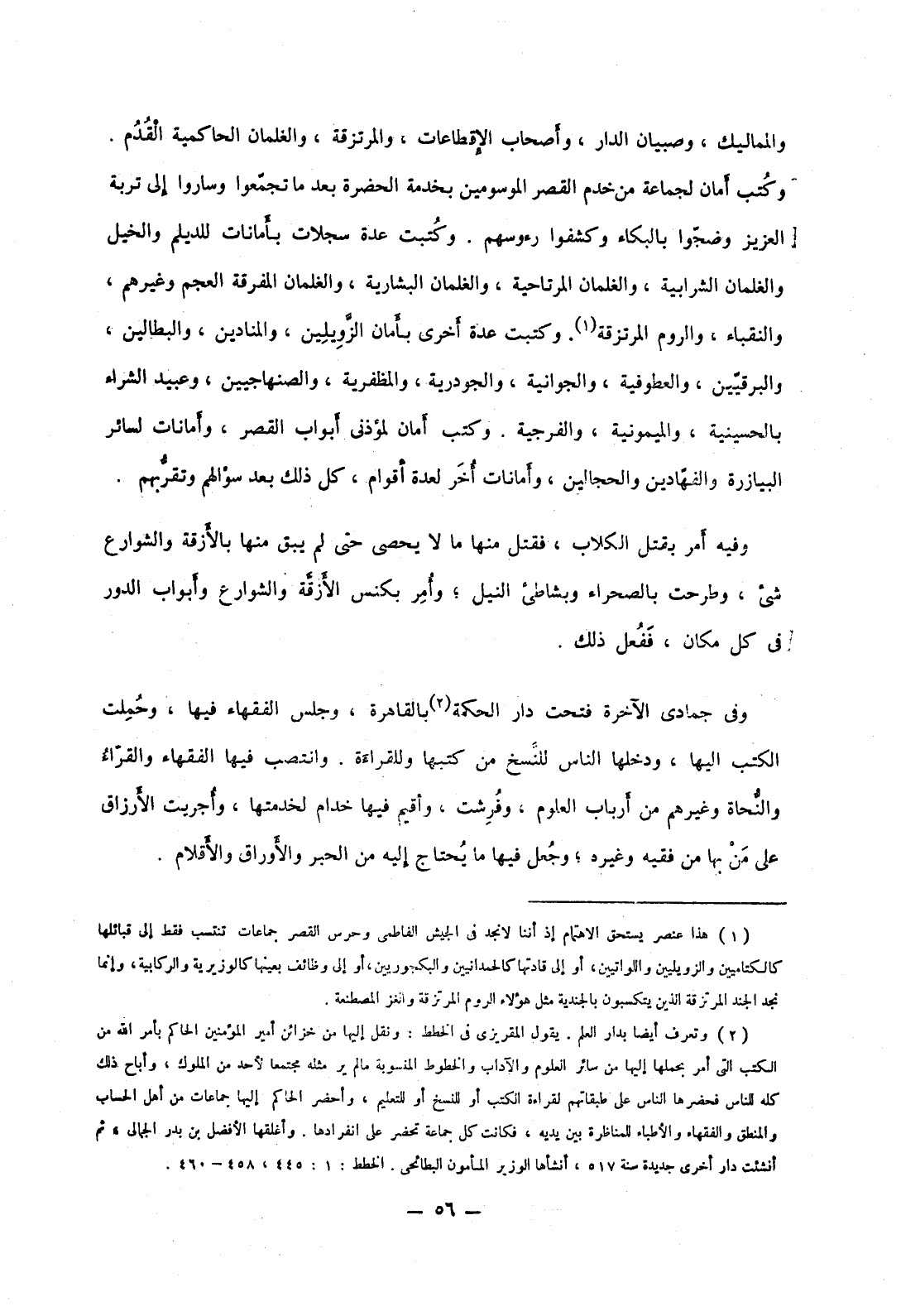 وفي جمادى الآخرة فتحت دار الحكمة بالقاهرة، وجلس الفقهاء فيها، وحملت الكتب إليها، ودخلها الناس للنسخ من كتبها وللقراءة. وانتصب فيها الفقراء والقراء والنحاة وغيرهم من أرباب العلوم، وفرشت، وأقيم فيها خدام لخدمتها، وأجريت الأرزاق على من بها من فقيه وغيره؛ وجعل فيها ما يحتاج إليه من الحبر والأوراق والأقلام.