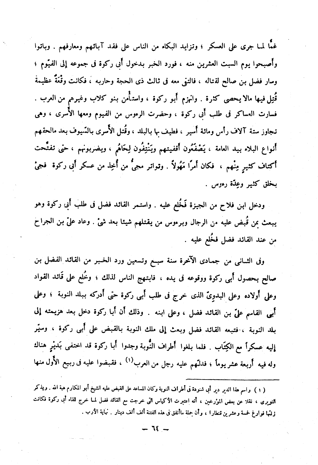 ودخل ابن فلاح من الجيزة فخلع عليه. واستمر القائد فضل في طلب أبي ركوة هو يبعث بمن قبض عليه من الرجال وبرؤوس من يقتلهم شيئاً بعد شيء. وعاد علي بن الجراح من عند القائد فضل فخلع عليه.