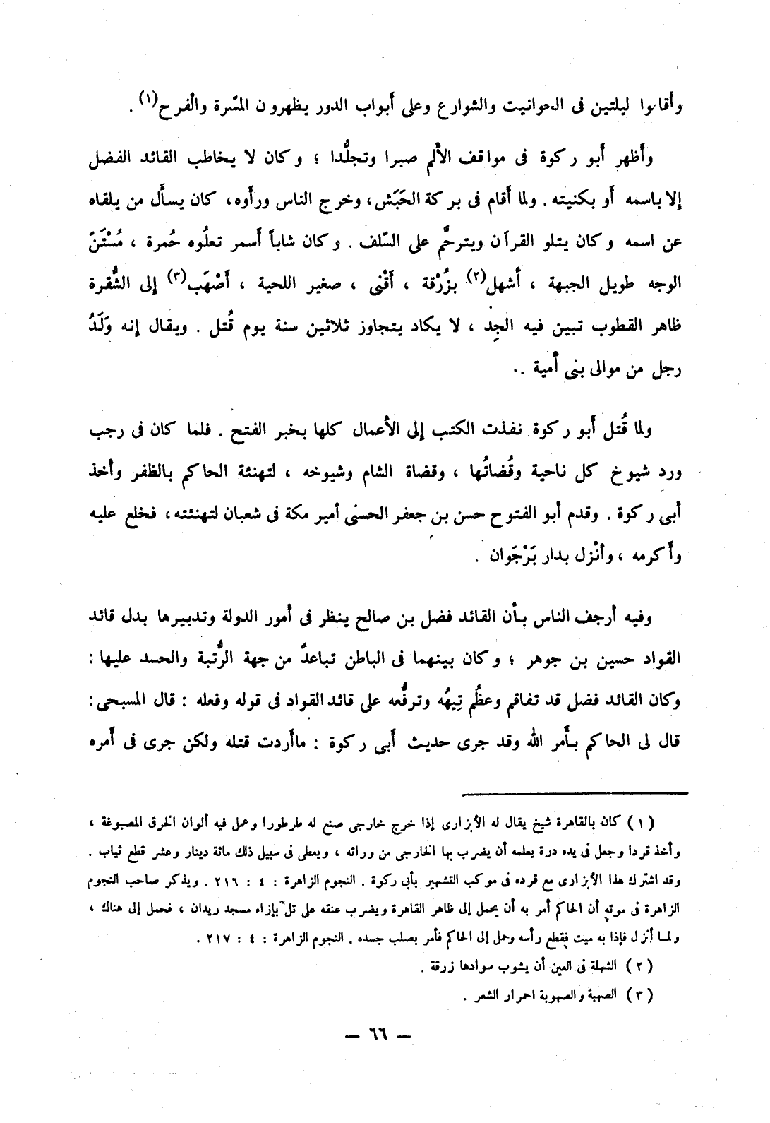 وفيه أرجف الناس بأن القائد فضل بن صالح ينظر في أمور الدولة وتدبيرها بدل قائد القواد حسين بن جوهر؛ وكان بينهما في الباطن تباعد من جهة الرتبة والحسد عليها: وكان القائد فضل قد تفاقم وعظم تيهه وترفعه على قائد القواد في قوله وفعله: قال المسبحي: قال لي الحاكم بأمر الله وقد جرى حديث أبي ركوة: ما أردت قتله ولكن جرى في أمره
