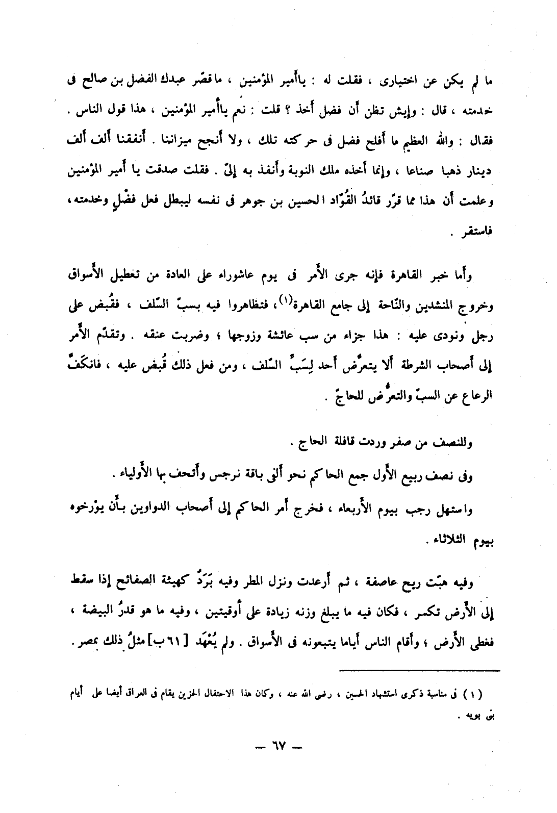 وأما خبر القاهرة فإنه جرى الأمر في يوم عاشوراء على العادة من تعطيل الأسواق وخروج المنشدين والناحة إلى جامع القاهرة، فتظاهروا فيه بسب السلف، فقبض على رجل ونودي عليه: هذا جزاء من سب عائشة وزوجها؛ وضربت عنقه. وتقدم الأمر إلى أصحاب الشرطة ألا يتعرض أحد لسب السلف، ومن فعل ذلك قبض عليه، فانكف الرعاع عن السب والتعرض للحاج.