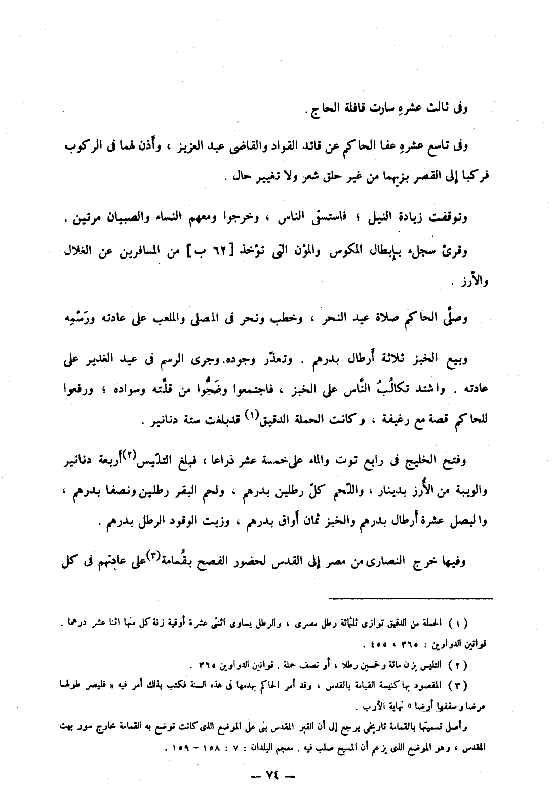 وصلى الحاكم صلاة عيد النحر، وخطب ونحر في المصلى والملعب على عادته ورسمه وبيع الخبز ثلاثة أرطال بدرهم. وتعذر وجوده. وجرى الرسم في عيد الغدير على عادته. واشتد تكالب الناس على الخبز، فاجتمعوا وضجوا من قلته وسواده؛ ورفعوا للحاكم قصة مع رغيفة، وكانت الحملة الدقيق قد بلغت ستة دنانير.