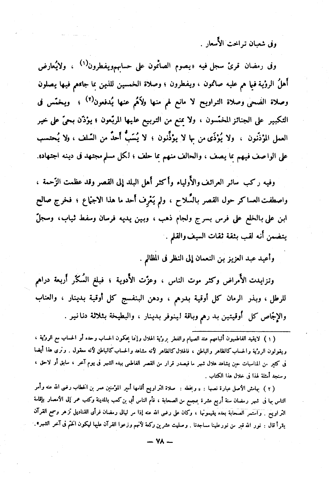 وفي رمضان قرئ سجل فيه يصوم الصائمون على حسابهم ويفطرون، ولا يعارض أهل الرؤية فيما هم عليه صائمون، ويفطرون؛ وصلاة الخمسين للذين بما جاءهم فيها يصلون وصلاة الضحى وصلاة التراويح لا مانع لهم منها ولاهم عنها يدفعون؛ ويخمس في التكبير على الجنائز المخمسون، ولا يمنع من التربيع عليها المربعون؛ يؤذن بحي على خير العمل المؤذنون، ولا يؤذى من بها لا يؤذنون؛ لا يسب أحد من السلف، ولا يحتسب على الواصف فيهم بما يصف، والحالف منهم بما حلف؛ لكل مسلم مجتهد في دينه اجتهاد.