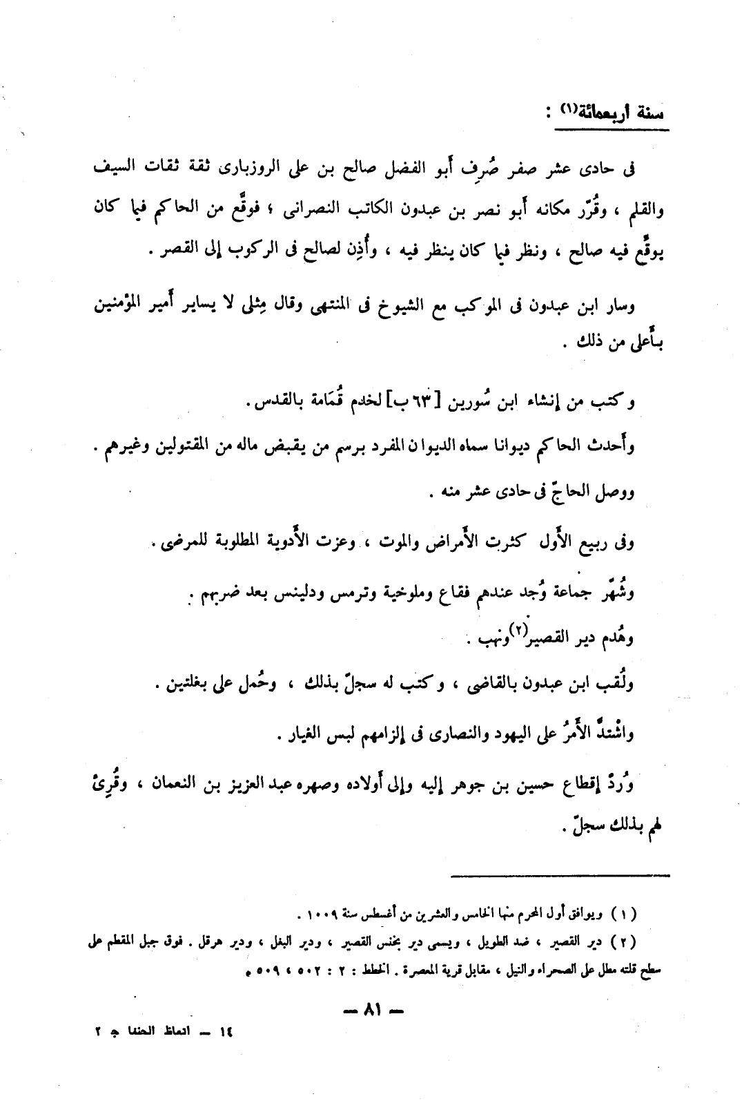 في حادي عشر صفر صرف أبو الفضل صالح بن علي الروزباري ثقة ثقات السيف والقلم، وقرر مكانه أبو نصر بن عبدون الكاتب النصراني؛ فوقع من الحاكم فيما كان يوقع فيه صالح، ونظر فيما كان ينظر فيه، وأذن لصالح في الركوب إلى القصر.