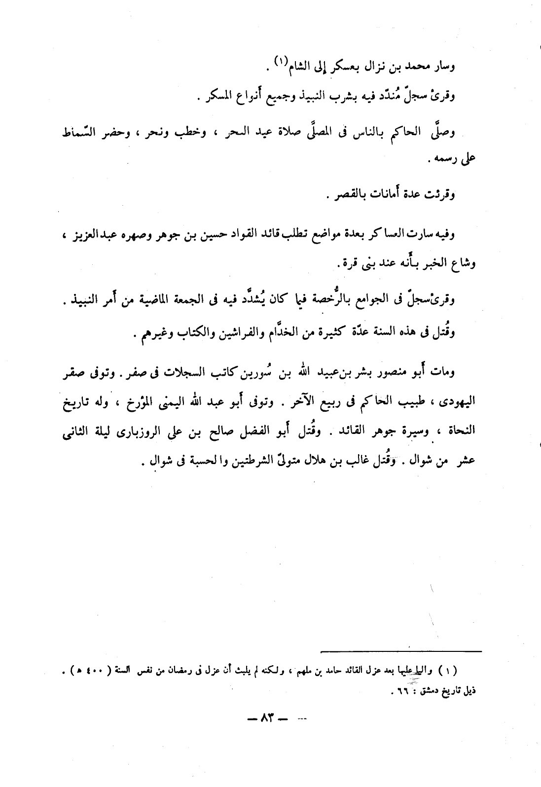 وفيه سارت العساكر بعدة مواضع تطلب قائد القواد حسين بن جوهر وصهره عبد العزيز، وشاع الخبر بأنه عند بني قرة.