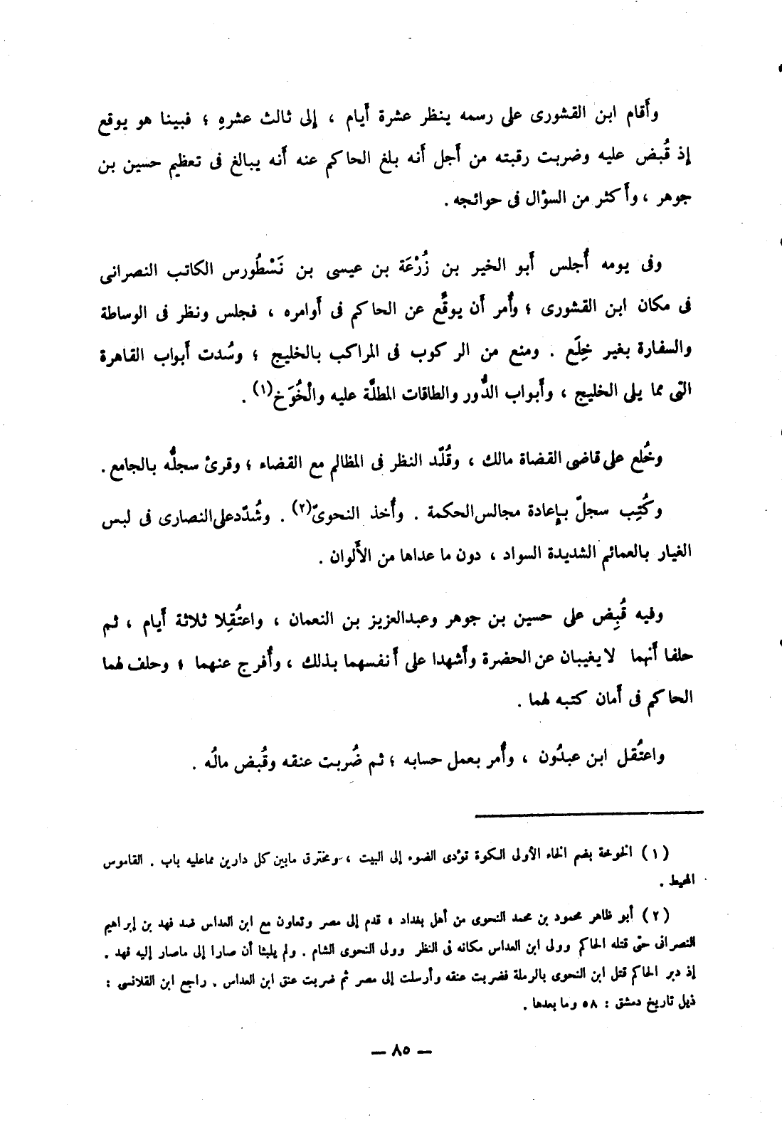 وأقام ابن القشوري على رسمه ينظر عشرة أيام، إلى ثالث عشره؛ فبينا هو يوقع إذ قبض عليه وضربت رقبته من أجل أنه بلغ الحاكم عنه أنه يبالغ في تعظيم حسين بن جوهر، وأكثر من السؤال في حوائجه.