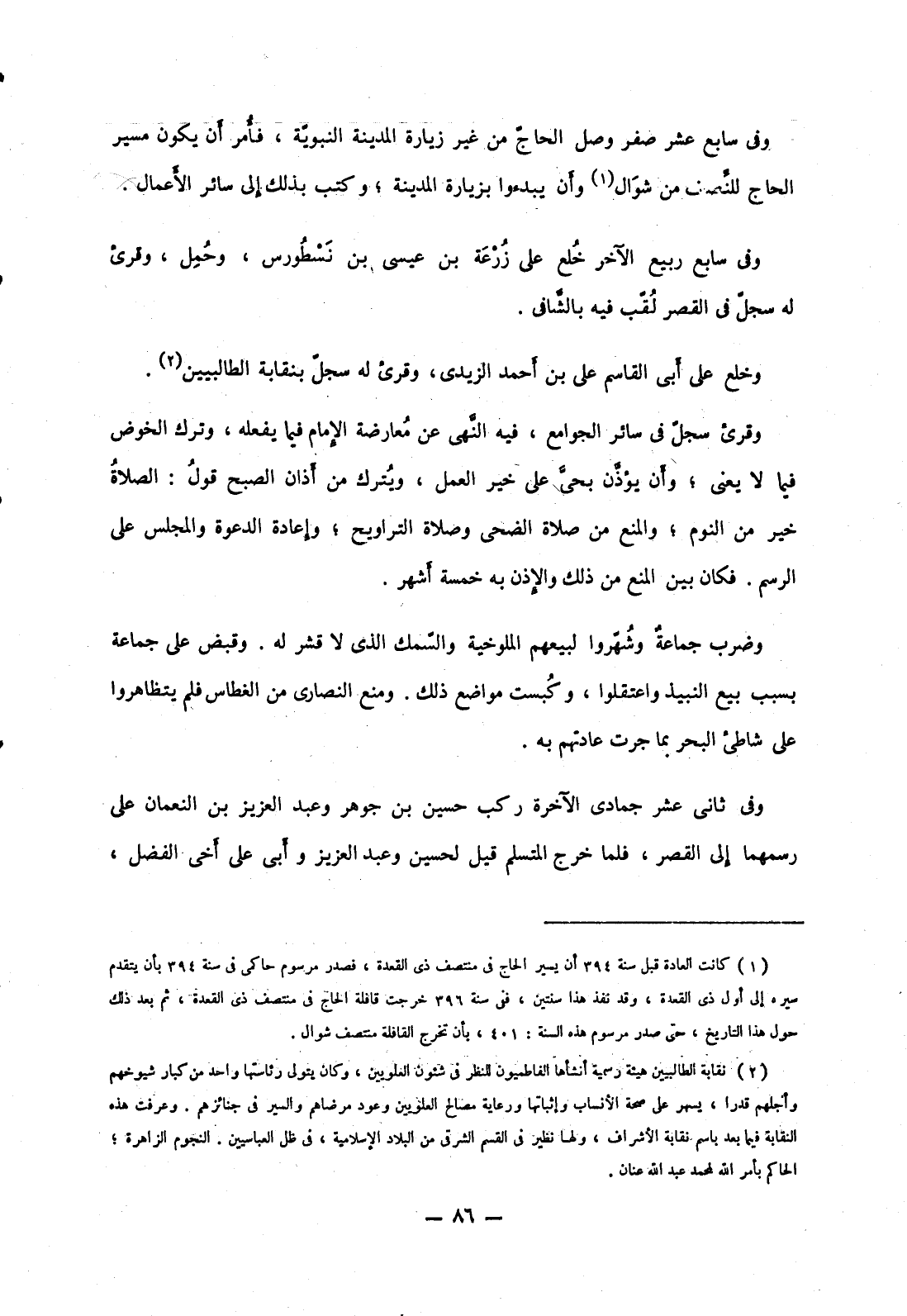 وفي سابع عشر صفر وصل الحاج من غير زيارة المدينة النبوية، فأمر أن يكون مسير الحاج للنصف من شوال وأن يبدءوا بزيارة المدينة؛ وكتب بذلك إلى سائر الأعمال.