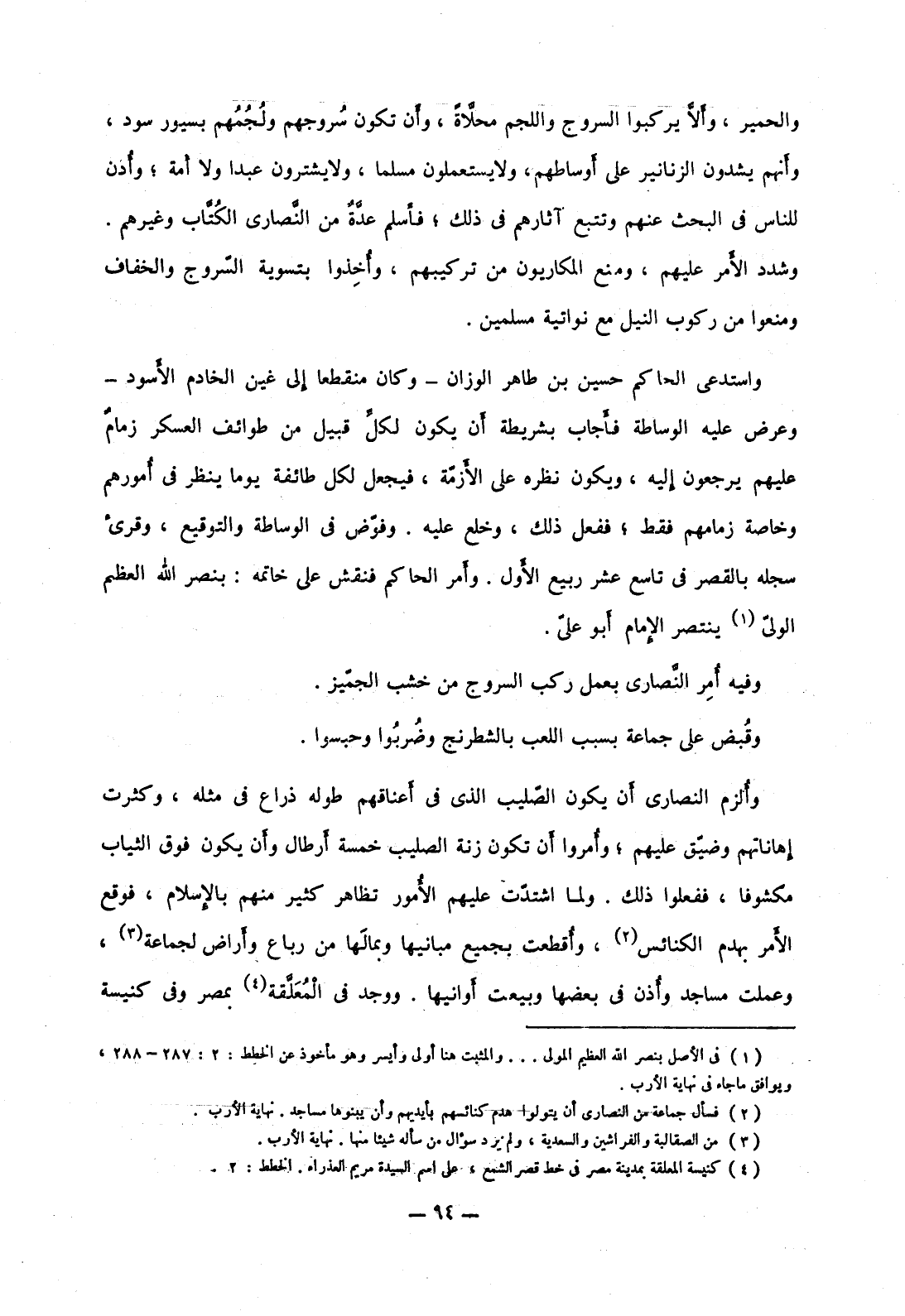 والحمير، وألا يركبوا السروج واللجم محلاةً، وأن تكون سروجهم ولجمهم بسيور سود، وأنهم يشدون الزنانير على أوساطهم، ولا يستعملون مسلما، ولا يشترون عبدا ولا أمة؛ وأذن للناس في البحث عنهم وتتبع آثارهم في ذلك؛ فأسلم عدة من النصارى الكتاب وغيرهم. وشدد الأمر عليهم، ومنع المكاريون من تركيبهم، وأخذوا بتسوية السروج والخفاف ومنعوا من ركوب النيل مع نواتية مسلمين.