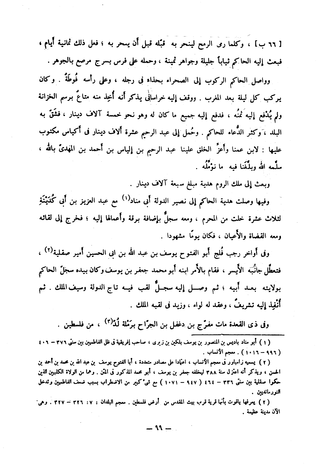 وكلما رمى الرمح لينحر به قبله قبل أن ينحر به؛ فعل ذلك ثمانية أيام، فعبث إليه الحاكم ثياباً جليلة وجواهر ثمينة، وحمله على فرس بسرج مرصع بالجوهر.