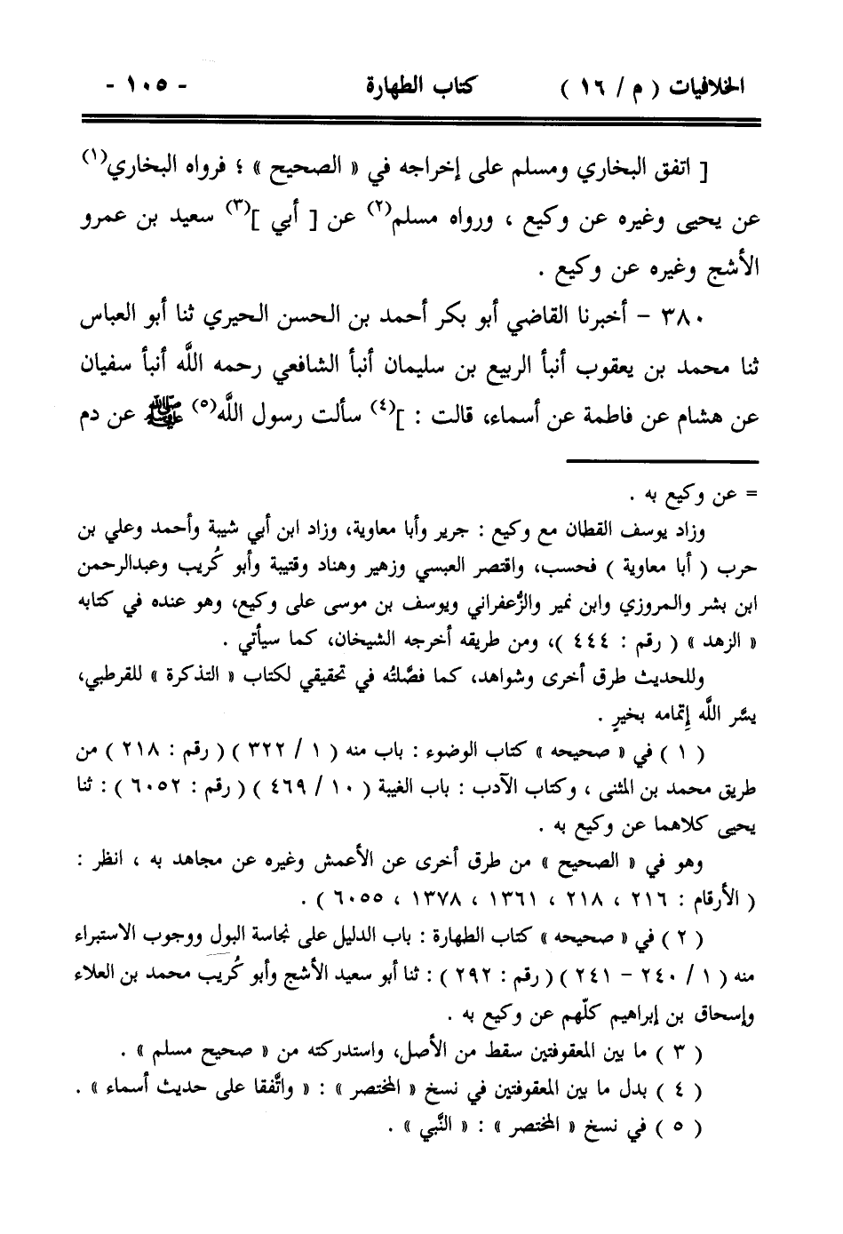 380- أخبرنا القاضي أبو بكر أحمد بن الحسن الحيري ثنا أبو العباس ثنا محمد بن يعقوب أنبأ الربيع بن سليمان أنبأ الشافعي رحمه الله أنبأ سفيان عن هشام عن فاطمة عن أسماء، قالت:] سألت رسول الله صلى الله عليه وسلم عن دم