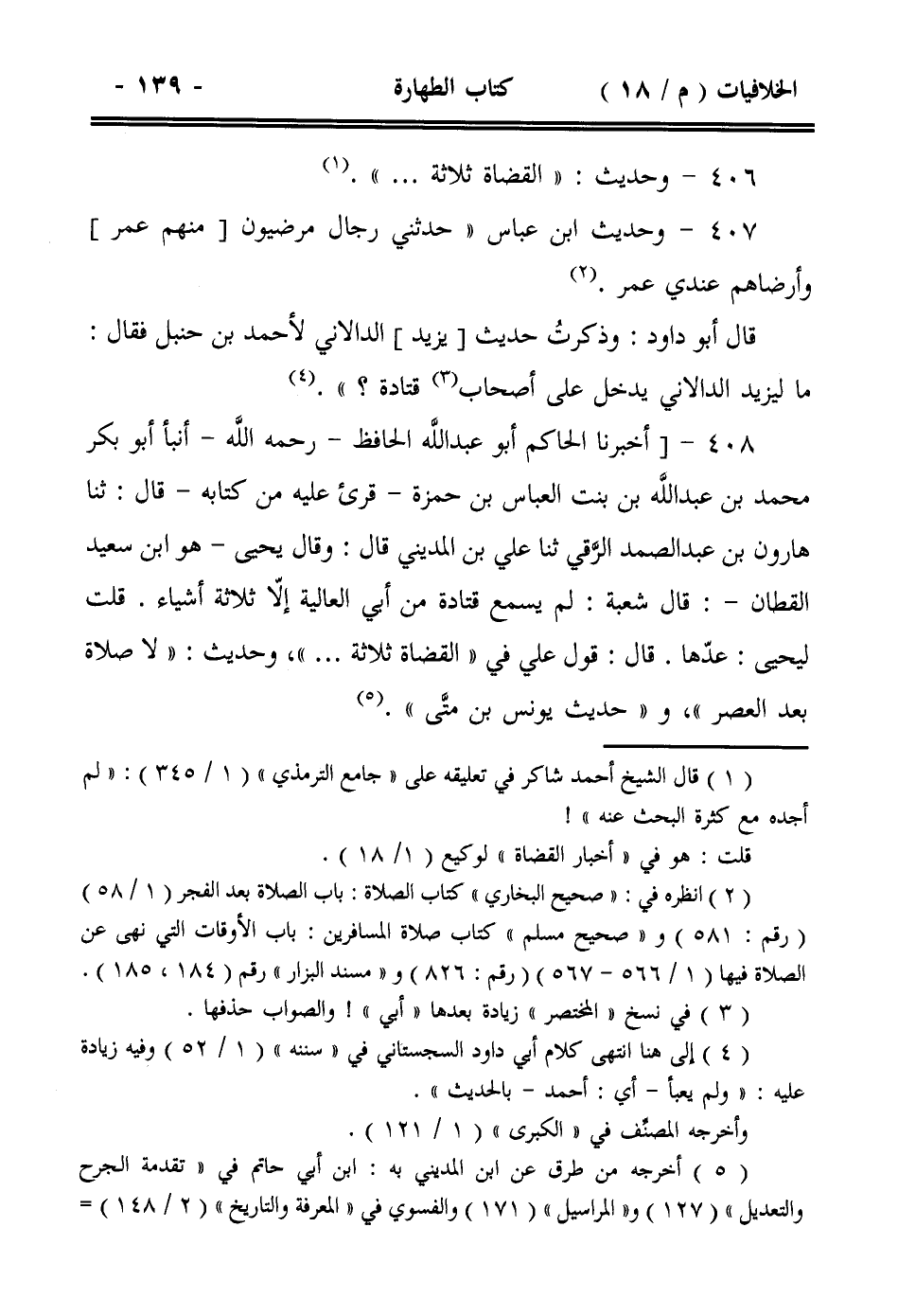 408- [أخبرنا الحاكم أبو عبد الله الحافظ -رحمه الله- أنبأ أبو بكر محمد بن عبد الله بن بنت العباس بن حمزة -قرئ عليه من كتابه- قال: ثنا هارون بن عبد الصمد الرقي ثنا علي بن المديني قال: وقال يحيى -هو ابن سعيد القطان-: قال شعبة: لم يسمع قتادة من أبي العالية إلا ثلاثة أشياء. قلت ليحيى: عدها. قال: قول علي في ((القضاة ثلاثة .. .. ))، وحديث: ((لا صلاة بعد العصر))، و((حديث يونس بن متى)).