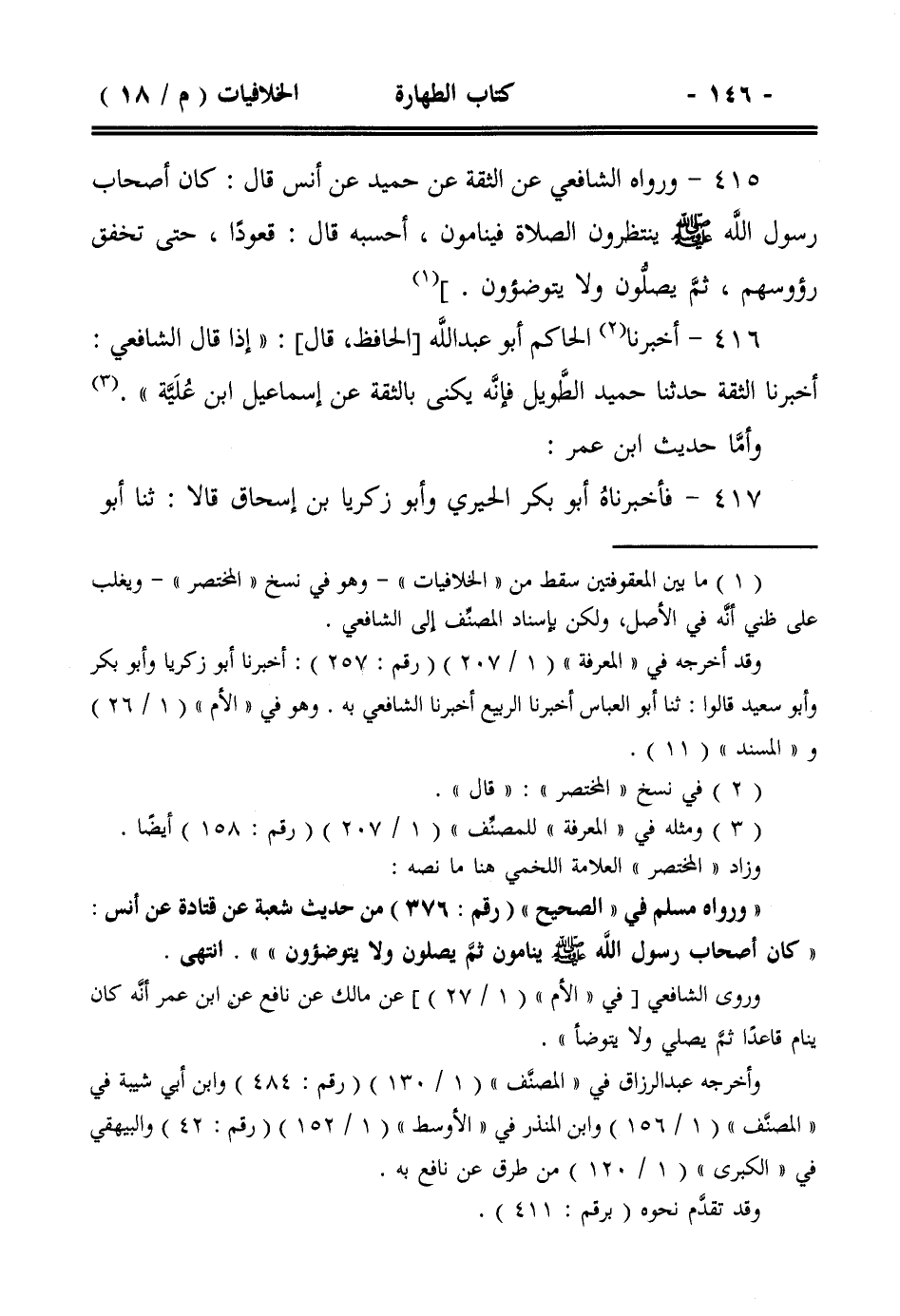 415- ورواه الشافعي عن الثقة عن حميد عن أنس قال: كان أصحاب رسول الله صلى الله عليه وسلم ينتظرون الصلاة فينامون، أحسبه قال: قعوداً، حتى تخفق رؤوسهم، ثم يصلون ولا يتوضؤون.]