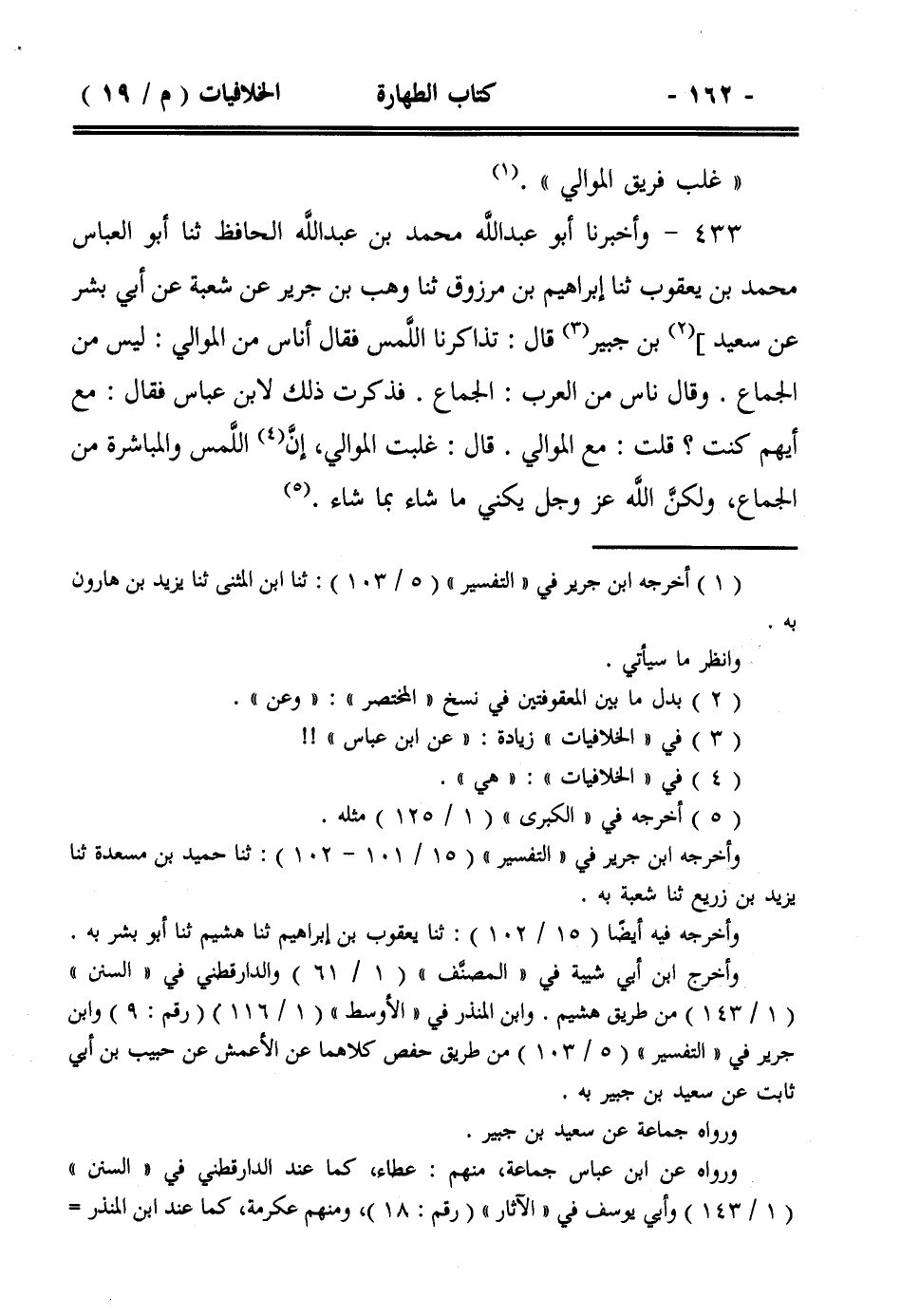 433- وأخبرنا أبو عبد الله محمد بن عبد الله الحافظ ثنا أبو العباس محمد بن يعقوب ثنا إبراهيم بن مرزوق ثنا وهب بن جرير عن شعبة عن أبي بشر عن سعيد] بن جبير قال: تذاكرنا اللمس فقال أناس من الموالي: ليس من الجماع. وقال ناس من العرب: الجماع. فذكرت ذلك لابن عباس فقال: مع أيهم كنت؟ قلت: مع الموالي. قال: غلبت الموالي، إن اللمس والمباشرة من الجماع، ولكن الله عز وجل يكني ما شاء بما شاء.