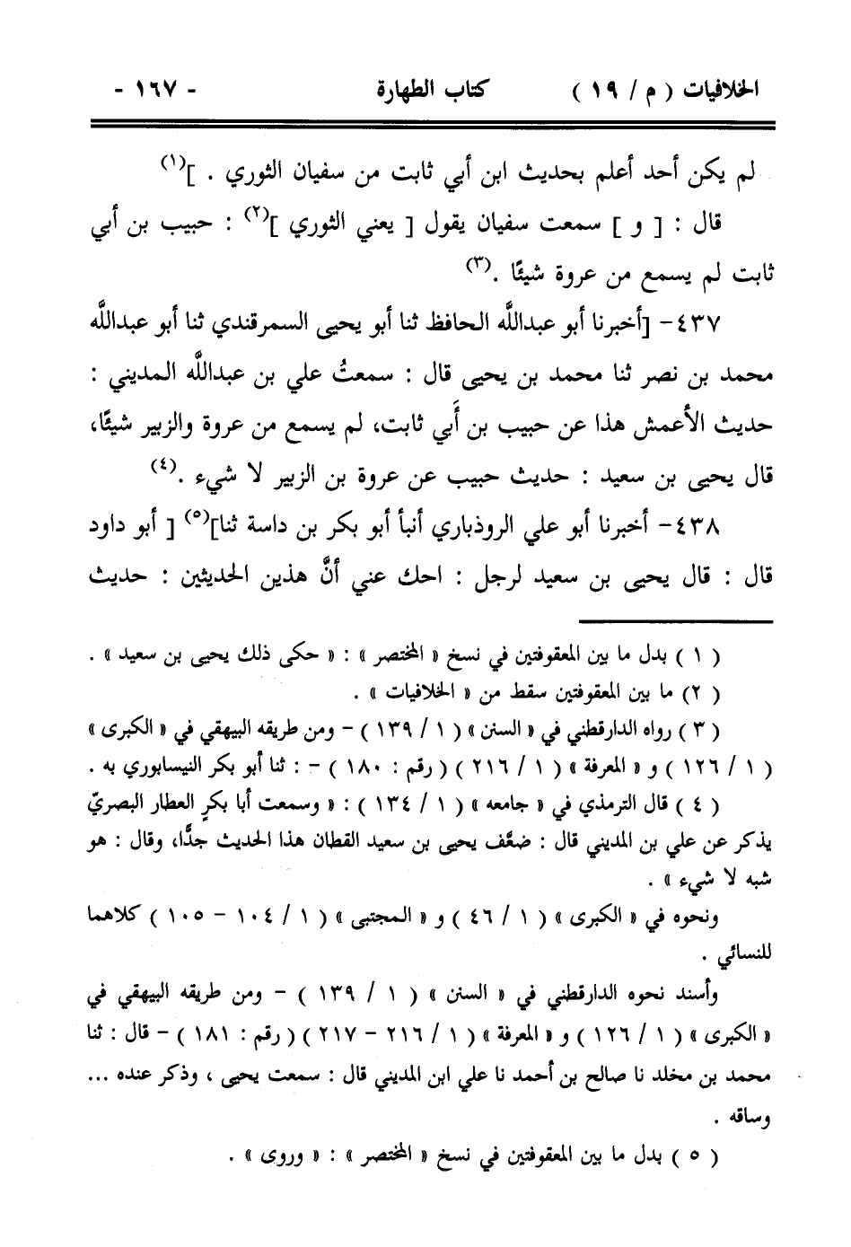 437- [أخبرنا أبو عبد الله الحافظ ثنا أبو يحيى السمرقندي ثنا أبو عبد الله محمد بن نصر ثنا محمد بن يحيى قال: سمعت علي بن عبد الله المديني: حديث الأعمش هذا عن حبيب بن أبي ثابت، لم يسمع من عروة والزبير شيئاً، قال يحيى بن سعيد: حديث حبيب عن عروة بن الزبير لا شيء.