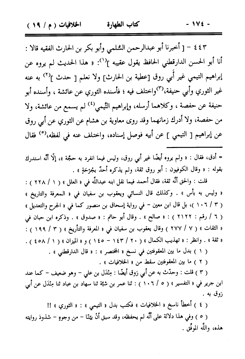 443- [أخبرنا أبو عبد الرحمن السلمي وأبو بكر بن الحارث الفقيه قالا: أنا أبو الحسن الدارقطني الحافظ يقول عقيبه]: ((هذا الحديث لم يروه عن إبراهيم التيمي غير أبي روق [عطية بن الحارث] ولا نعلم [حدث] به عنه غير الثوري وأبي حنيفة، واختلف فيه؛ فأسنده الثوري عن عائشة، وأسنده أبو حنيفة عن حفصة، وكلاهما أرسله، وإبراهيم التيمي لم يسمع من عائشة، ولا من حفصة، ولا أدرك زمانهما وقد روى معاوية بن هشام عن الثوري عن أبي روق عن إبراهيم [التيمي] عن أبيه فوصل إسناده، واختلف عنه في لفظه، فقال