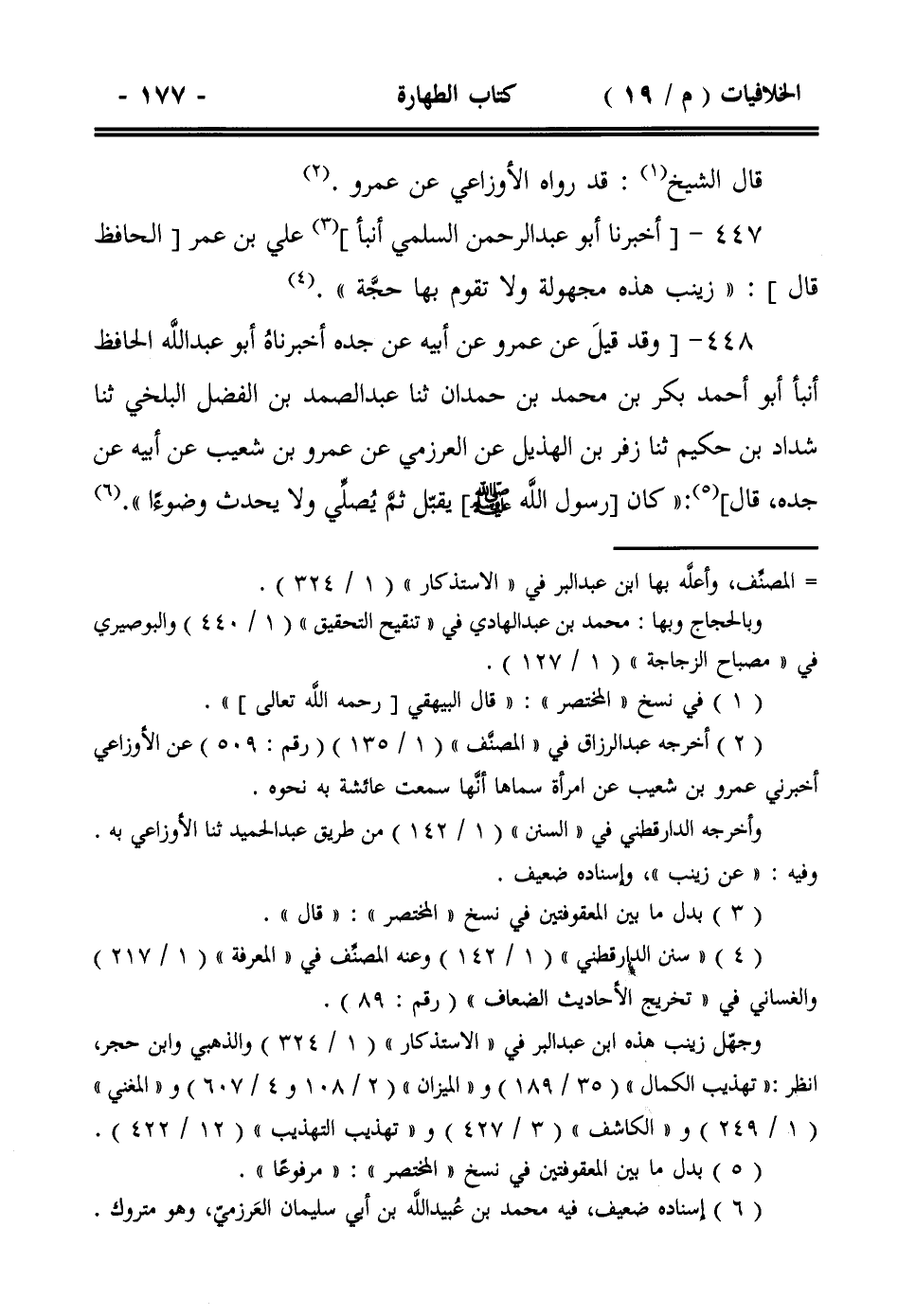 448- [وقد قيل عن عمرو عن أبيه عن جده أخبرناه أبو عبد الله الحافظ أنبأ أبو أحمد بكر بن محمد بن حمدان ثنا عبد الصمد بن الفضل البلخي ثنا شداد بن حكيم ثنا زفر بن الهذيل عن العرزمي عن عمرو بن شعيب عن أبيه عن جده، قال]: ((كان [رسول الله صلى الله عليه وسلم ] يقبل ثم يصلي ولا يحدث وضوءاً)).