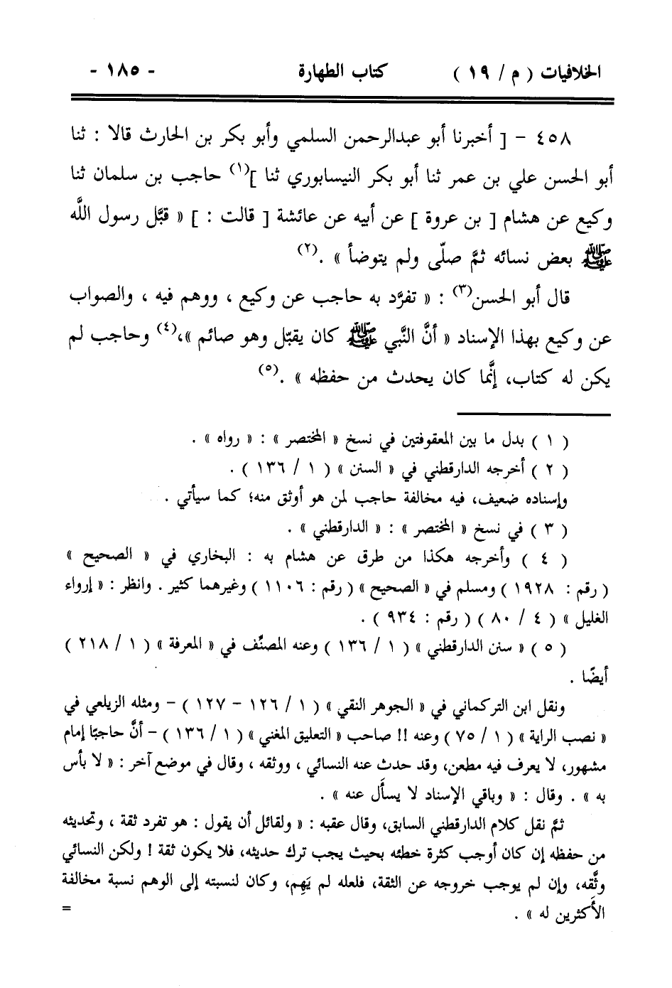 458- [أخبرنا أبو عبد الرحمن السلمي وأبو بكر بن الحارث قالا: ثنا أبو الحسن علي بن عمر ثنا أبو بكر النيسابوري ثنا] حاجب بن سلمان ثنا وكيع عن هشام [بن عروة] عن أبيه عن عائشة [قالت:] ((قبل رسول الله صلى الله عليه وسلم بعض نسائه ثم صلى ولم يتوضأ)).