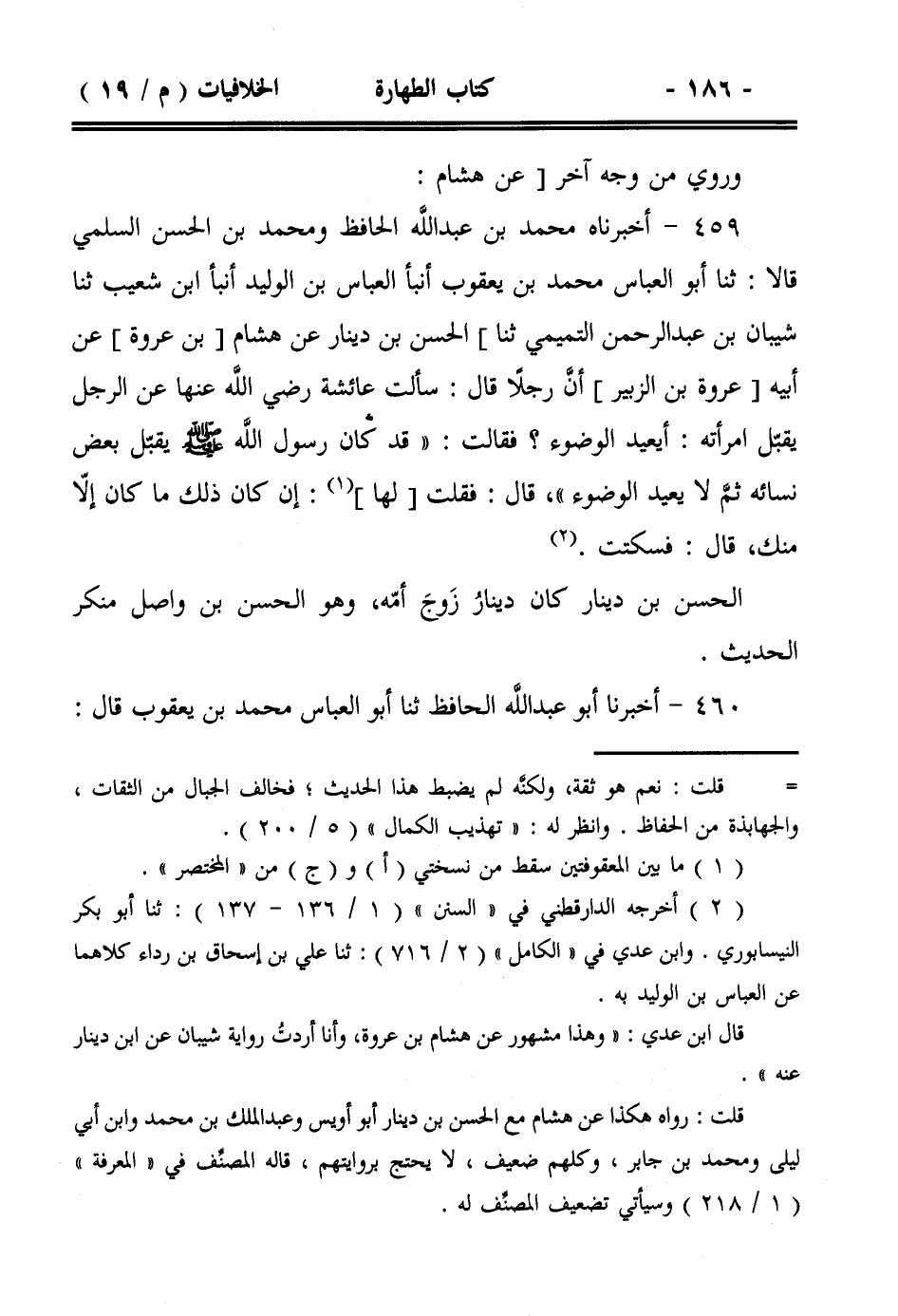 459- أخبرناه محمد بن عبد الله الحافظ ومحمد بن الحسن السلمي قالا: ثنا أبو العباس محمد بن يعقوب أنبأ العباس بن الوليد أنبأ ابن شعيب ثنا شيبان بن عبد الرحمن التميمي ثنا] الحسن بن دينار عن هشام [بن عروة]عن أبيه [عروة بن الزبير] أن رجلاً قال: سألت عائشة رضي الله عنها عن الرجل يقبل امرأته: أيعيد الوضوء؟ فقالت: ((قد كان رسول الله صلى الله عليه وسلم يقبل بعض نسائه ثم لا يعيد الوضوء))، قال: فقلت [لها]: إن كان ذلك ما كان إلا منك، قال: فسكتت.