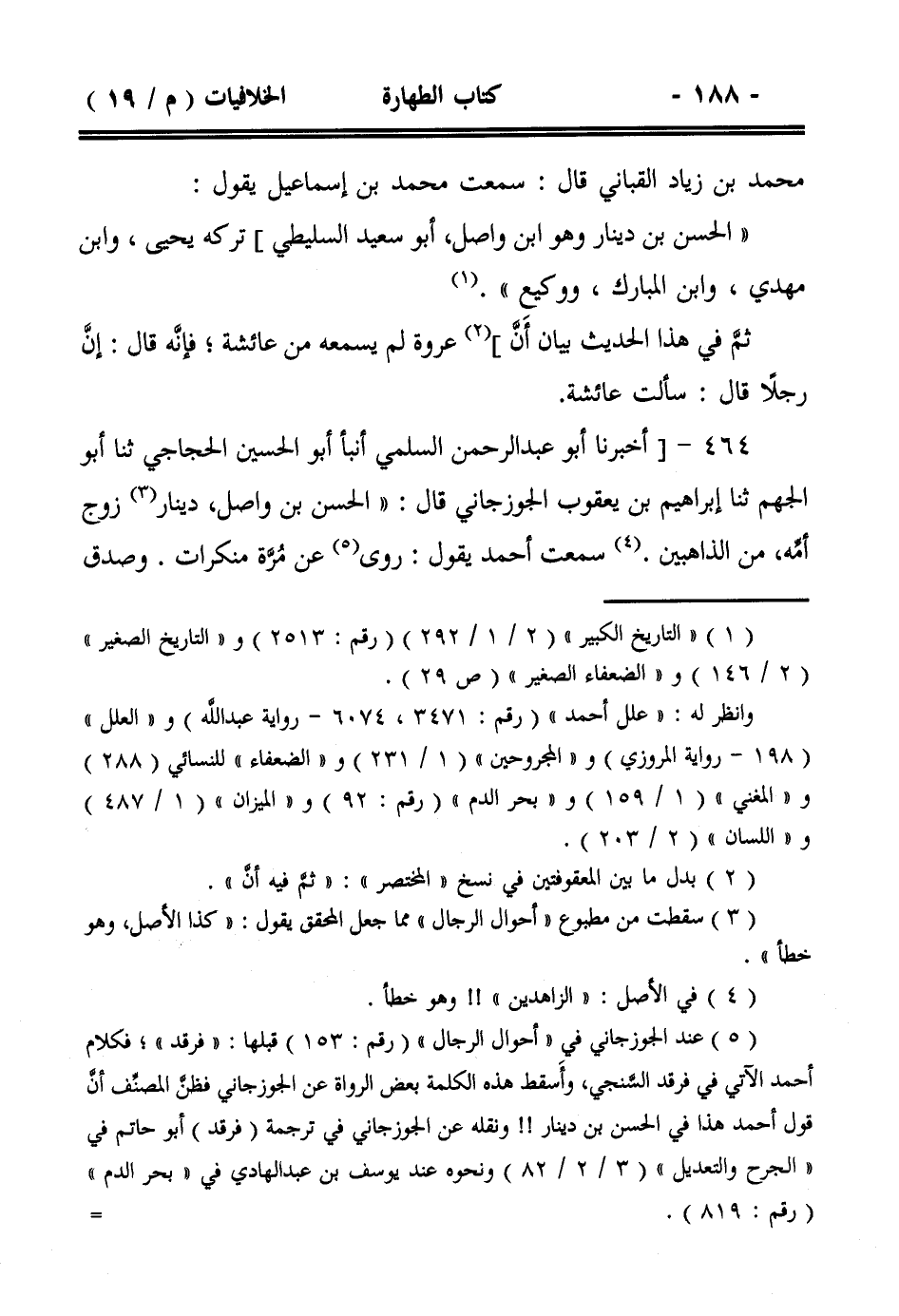 464- [أخبرنا أبو عبد الرحمن السلمي أنبأ أبو الحسين الحجاجي ثنا أبو الجهم ثنا إبراهيم بن يعقوب الجوزجاني قال: ((الحسن بن واصل، دينار زوج أمه، من الذاهبين. سمعت أحمد يقول: روى عن مرة منكرات. وصدق
