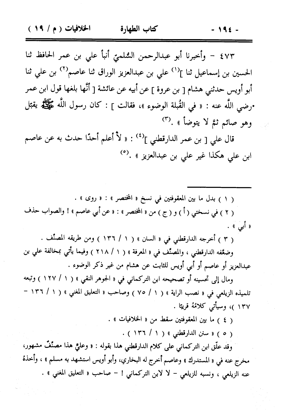 473- وأخبرنا أبو عبد الرحمن السلمي أنبأ علي بن عمر الحافظ ثنا الحسين بن إسماعيل ثنا] علي بن عبد العزيز الوراق ثنا عاصم بن علي ثنا أبو أويس حدثني هشام [بن عروة] عن أبيه عن عائشة [أنها بلغها قول ابن عمر رضي الله عنه: ((في القبلة الوضوء))، فقالت]: كان رسول الله صلى الله عليه وسلم يقبل وهو صائم ثم لا يتوضأ)).