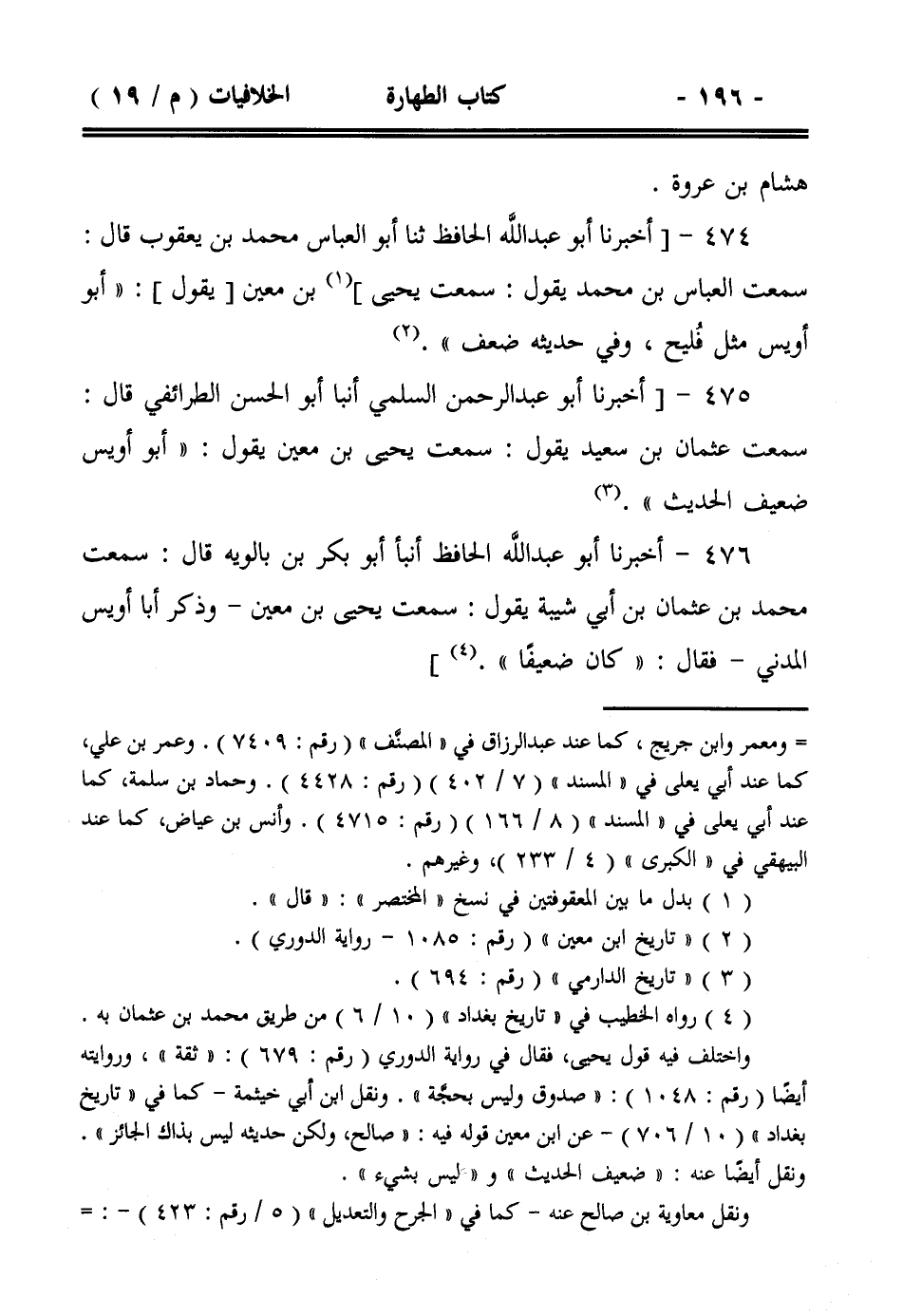 475- [أخبرنا أبو عبد الرحمن السلمي أنبأ أبو الحسن الطرائفي قال: سمعت عثمان بن سعيد يقول: سمعت يحيى بن معين يقول: ((أبو أويس ضعيف الحديث)).
