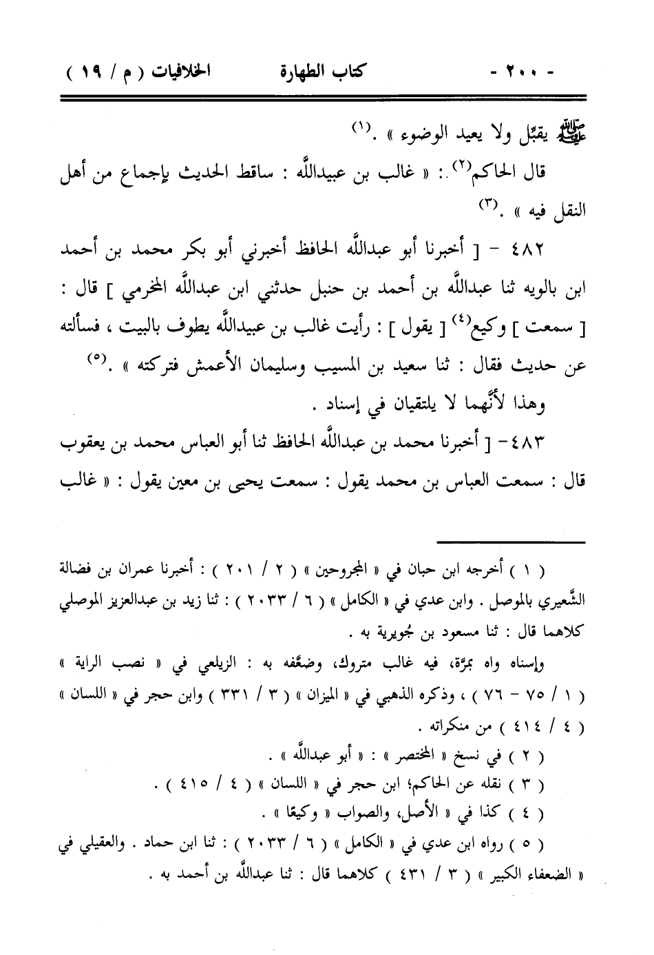 483- [أخبرنا محمد بن عبد الله الحافظ ثنا أبو العباس محمد بن يعقوب قال: سمعت العباس بن محمد يقول: سمعت يحيى بن معين يقول: (((غالب