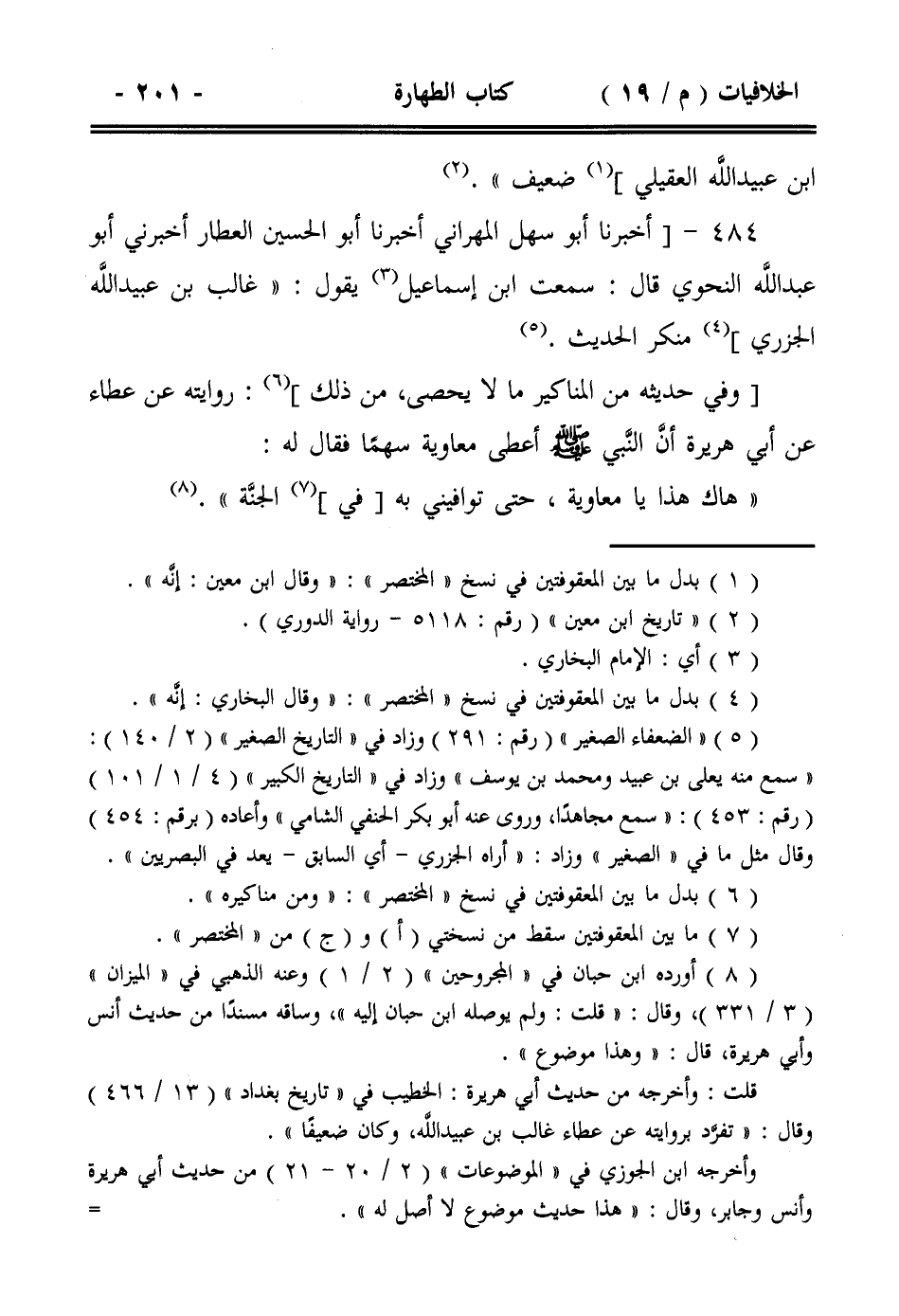 484- [أخبرنا أبو سهل المهراني أخبرنا أبو الحسين العطار أخبرني أبو عبد الله النحوي قال: سمعت ابن إسماعيل يقول: ((غالب بن عبيد الله الجزري] منكر الحديث.