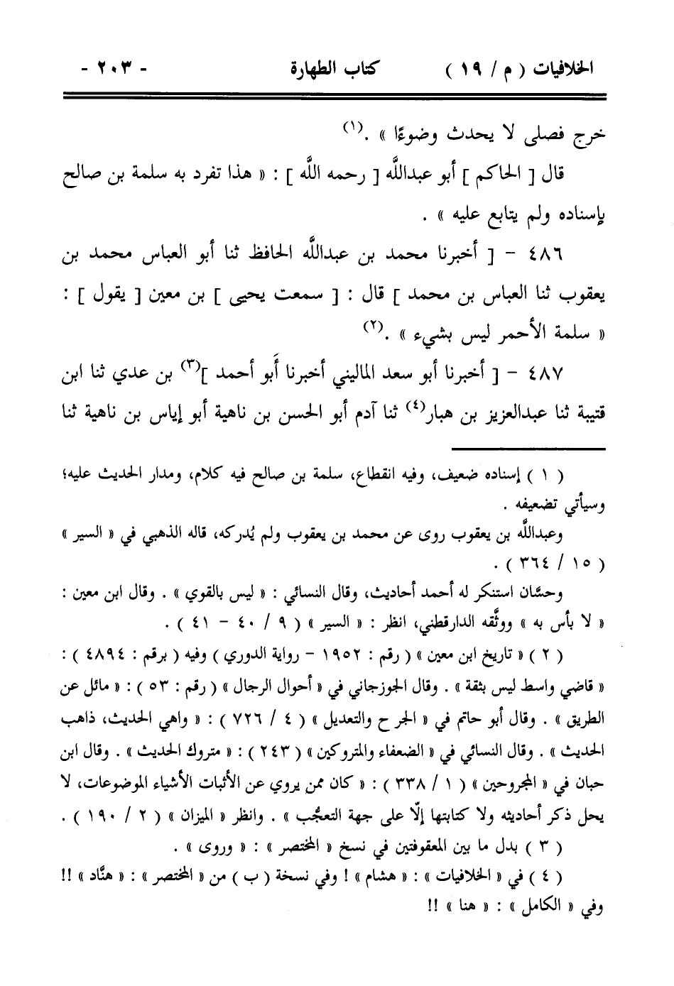 486- [أخبرنا محمد بن عبد الله الحافظ ثنا أبو العباس محمد بن يعقوب ثنا العباس بن محمد] قال: [سمعت يحيى] بن معين [يقول]: ((سلمة الأحمر ليس بشيء)).