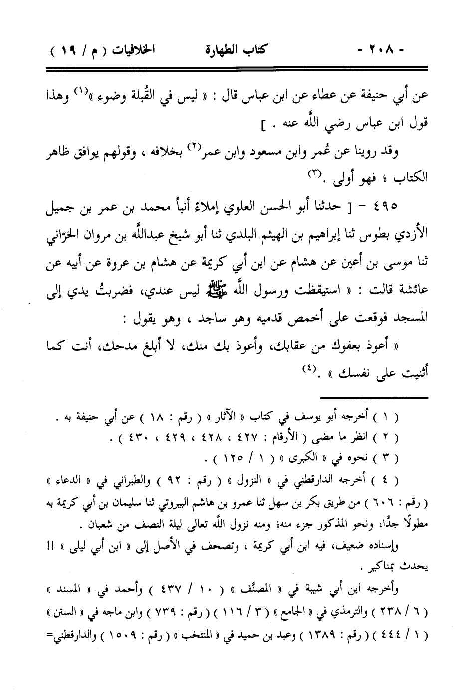 495- [حدثنا أبو الحسن العلوي إملاءً أنبأ محمد بن عمر بن جميل الأزدي بطوس ثنا إبراهيم بن الهيثم البلدي ثنا أبو شيخ عبد الله بن مروان الحراني ثنا موسى بن أعين عن هشام عن ابن أبي كريمة عن هشام بن عروة عن أبيه عن عائشة قالت: ((استيقظت ورسول الله صلى الله عليه وسلم ليس عندي، فضربت يدي إلى المسجد فوقعت على أخمص قدميه وهو ساجد، وهو يقول: