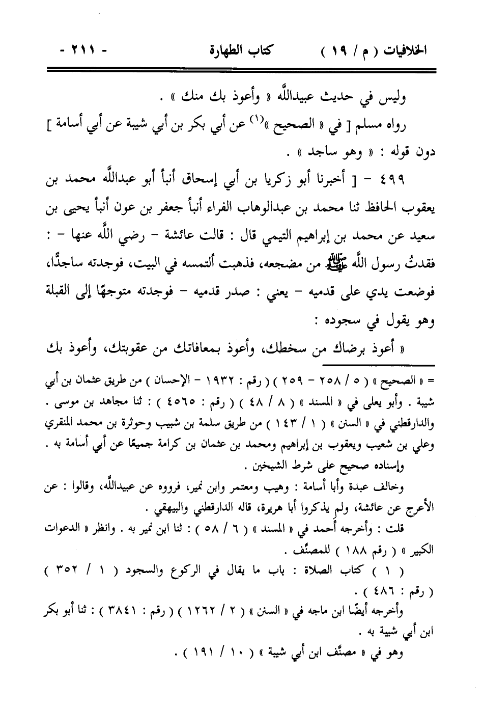 499- [أخبرنا أبو زكريا بن أبي إسحاق أنبأ أبو عبد الله محمد بن يعقوب الحافظ ثنا محمد بن عبد الوهاب الفراء أنبأ جعفر بن عون أنبأ يحيى بن سعيد عن محمد بن إبراهيم التيمي قال: قالت عائشة - رضي الله عنها-: فقدت رسول الله صلى الله عليه وسلم من مضجعه، فذهبت ألتمسه في البيت، فوجدته ساجداً، فوضعت يدي على قدميه -يعني: صدر قدميه- فوجدته متوجهاً إلى القبلة وهو يقول في سجوده: