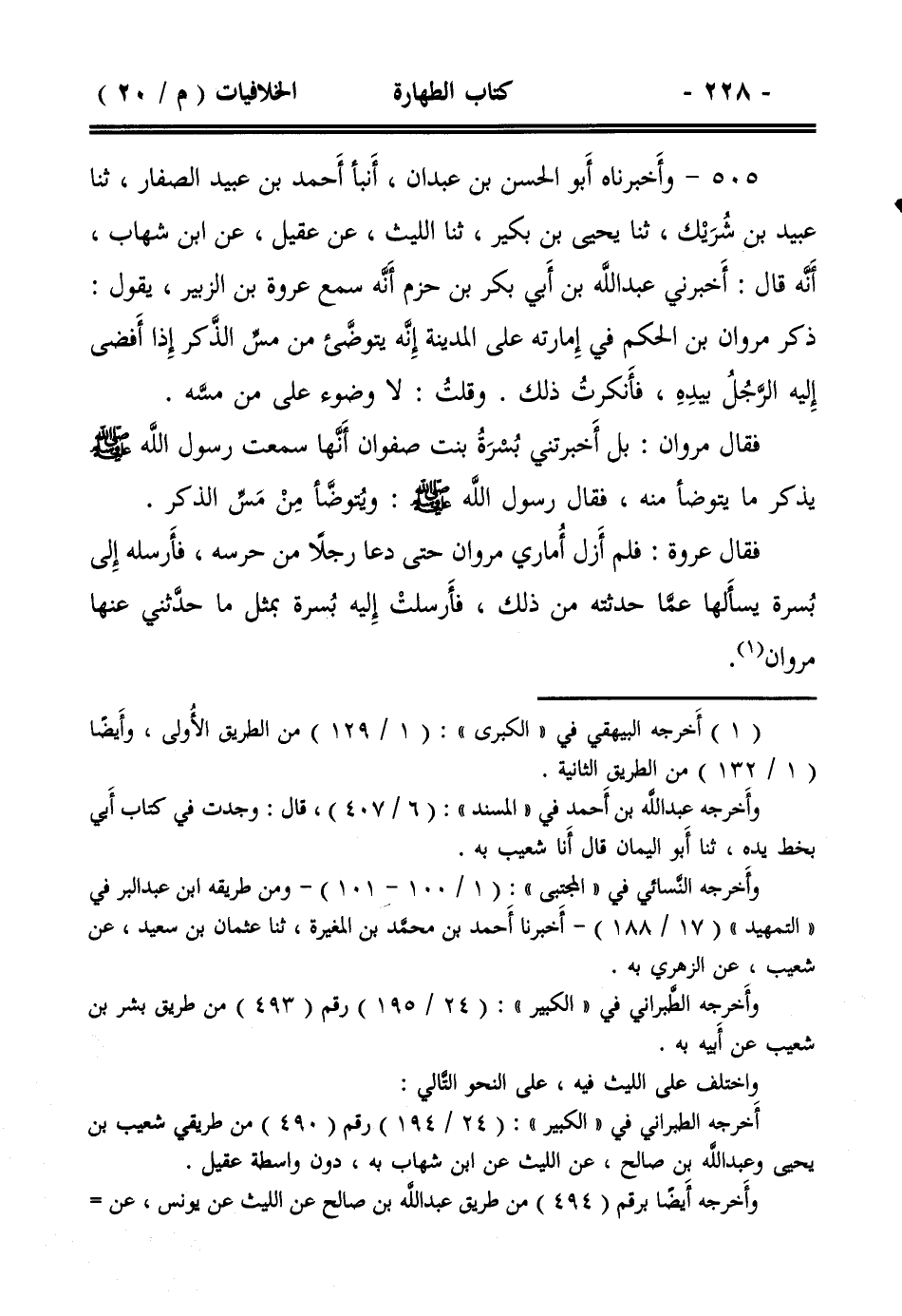 505- وأخبرناه أبو الحسن بن عبدان، أنبأ أحمد بن عبيد الصفار، ثنا عبيد بن شريك، ثنا يحيى بن بكير، ثنا الليث، عن عقيل، عن ابن شهاب، أنه قال: أخبرني عبد الله بن أبي بكر بن حزم أنه سمع عروة بن الزبير، يقول: ذكر مروان بن الحكم في إمارته على المدينة إنه يتوضئ من مس الذكر إذا أفضى إليه الرجل بيده، فأنكرت ذلك. وقلت: لا وضوء على من مسه.